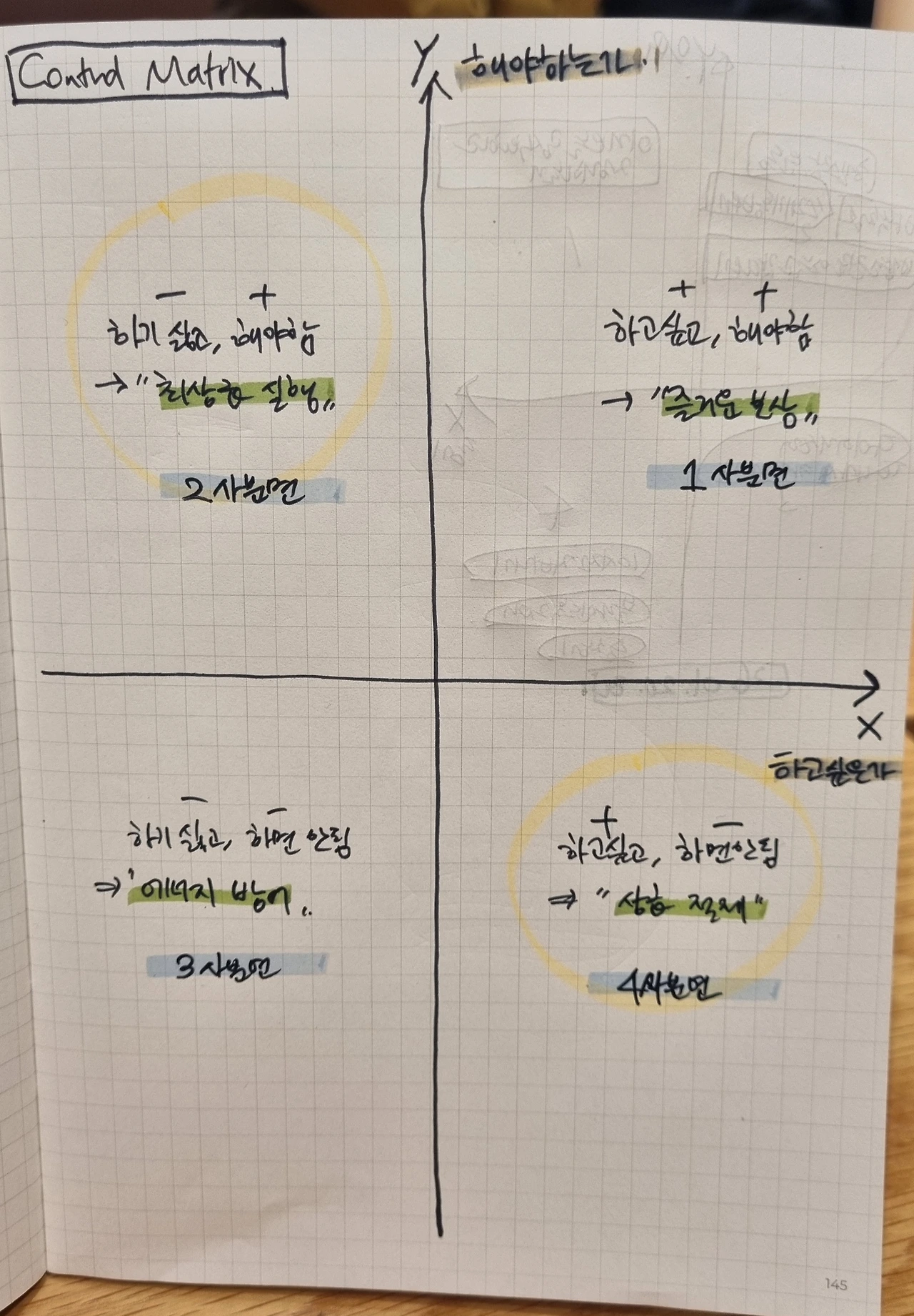 집에 와서는 다이어리에 좌표평면을 그렸다. X축은 '하고 싶은가(동기)', Y축은 '해야 하는가(의무)'. 이에 따라 내가 각별히 신경 써야 할 영역이 2사분면(하기 싫어도 해야 함, ex 운동)과 4사분면(하고 싶은데 하면 안 됨, ex 음주)이란 걸 시각화할 수 있었다. 더 중요한 건, 눈에 보이게 그리고 나니 선택지의 존재가 전제처럼 당연하고, 내게 선택할 수 있는 '권한'과 '능력'이 있는 것처럼 느껴졌다. 그전에는 습관이나 이미 수없이 실패한 경험에 비추어 의식에 떠오르지 않았을 선택지들이 온전히 동등하게 자리 잡기 시작했다. 게다가 좌표평면을 그리고 영역을 나누니 이게 마치 내 행동목록을 각 영역에 분류해 넣는 게임처럼 느껴져 재미있었다.