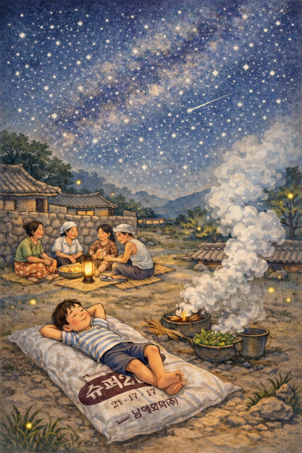 저녁 식사를 마친 이웃들은 하나 둘 자기 집 마당을 놔두고 돌담 밖 길가로 나왔다. 마대 자루나 비료 포대 하나씩을 들고 바람이 잘 드는 곳에 자리를 잡아 앉았다. 모이는 사람은 늘 같은 사람, 우리 엄마, 옆집 들몰댁, 뒷집 순영이 엄마, 아랫집 외숙모등이었다. 포대는 어린 내가 눕기에 충분한 크기였다.