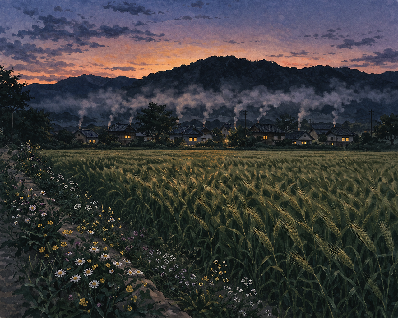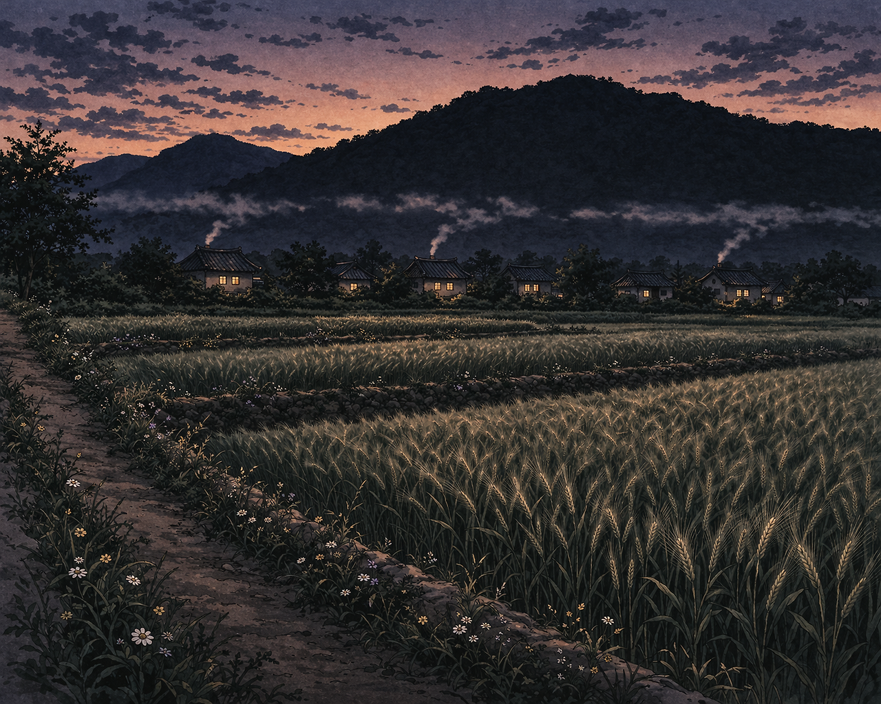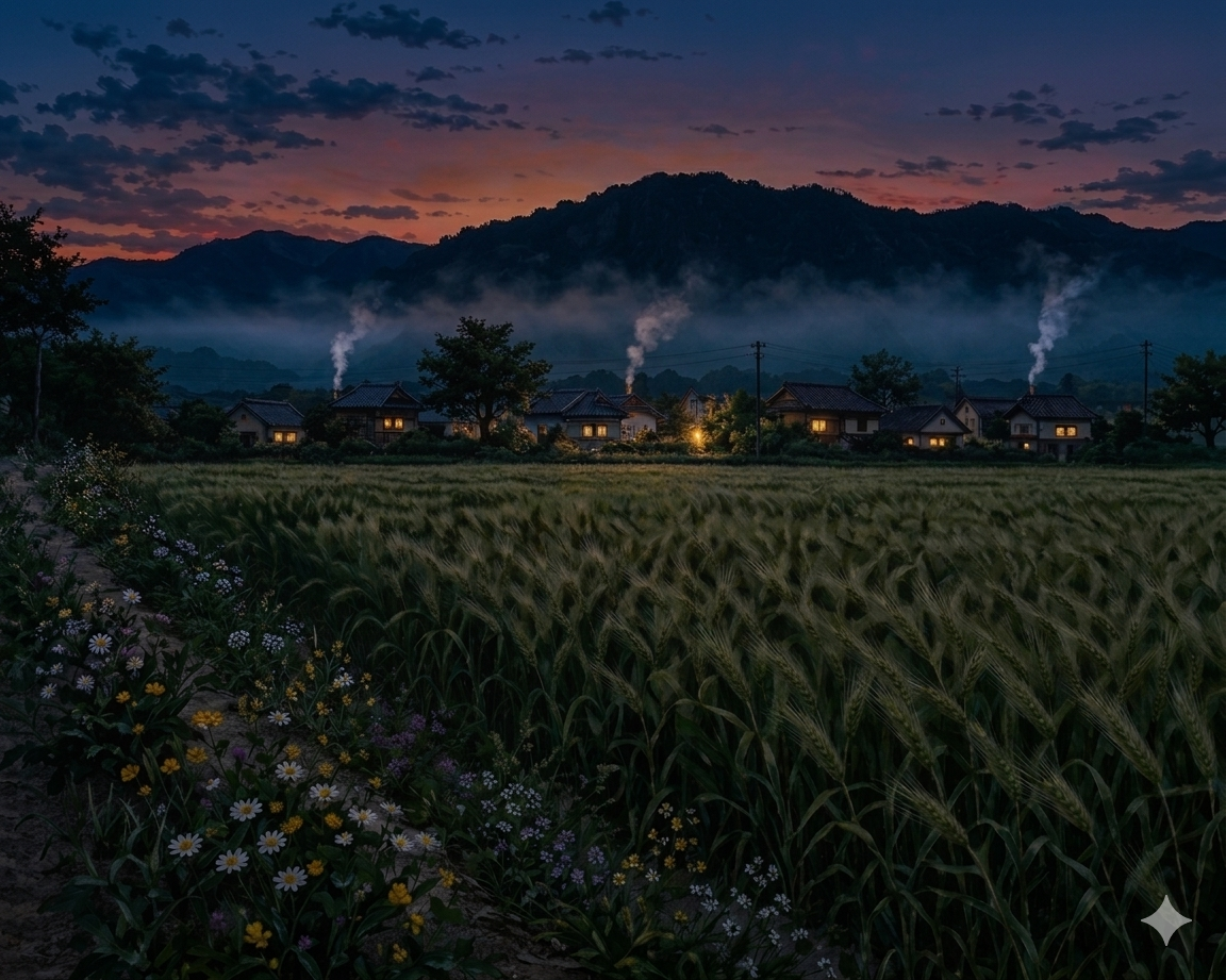 1. 해는 이미 서산 너머로 넘어갔고, 하늘은 완전히 어두워지기 직전, 해가 진 뒤의 여명이 조금 남아 있는 밝기입니다. 산은 검은 그림자에 가깝게 표현하고, 그 앞에는 시골 마을이 보이도록 해 주세요. 마을의 집집마다 굴뚝에서 밥 짓는 연기가 올라오고, 이 연기들은 일정한 높이에 이르러 서로 만나 공기 중에 층을 이루는 모습으로 표현해 주세요. 마을 앞에는 보리밭이 펼쳐져 있고, 논두렁에는 어둠 속에서도 고유의 빛을 발하고 있는 들꽃들이 보이도록, 이러한 분위기를 반영한 일러스트 드로잉 스타일의 삽화를 그려 주세요.