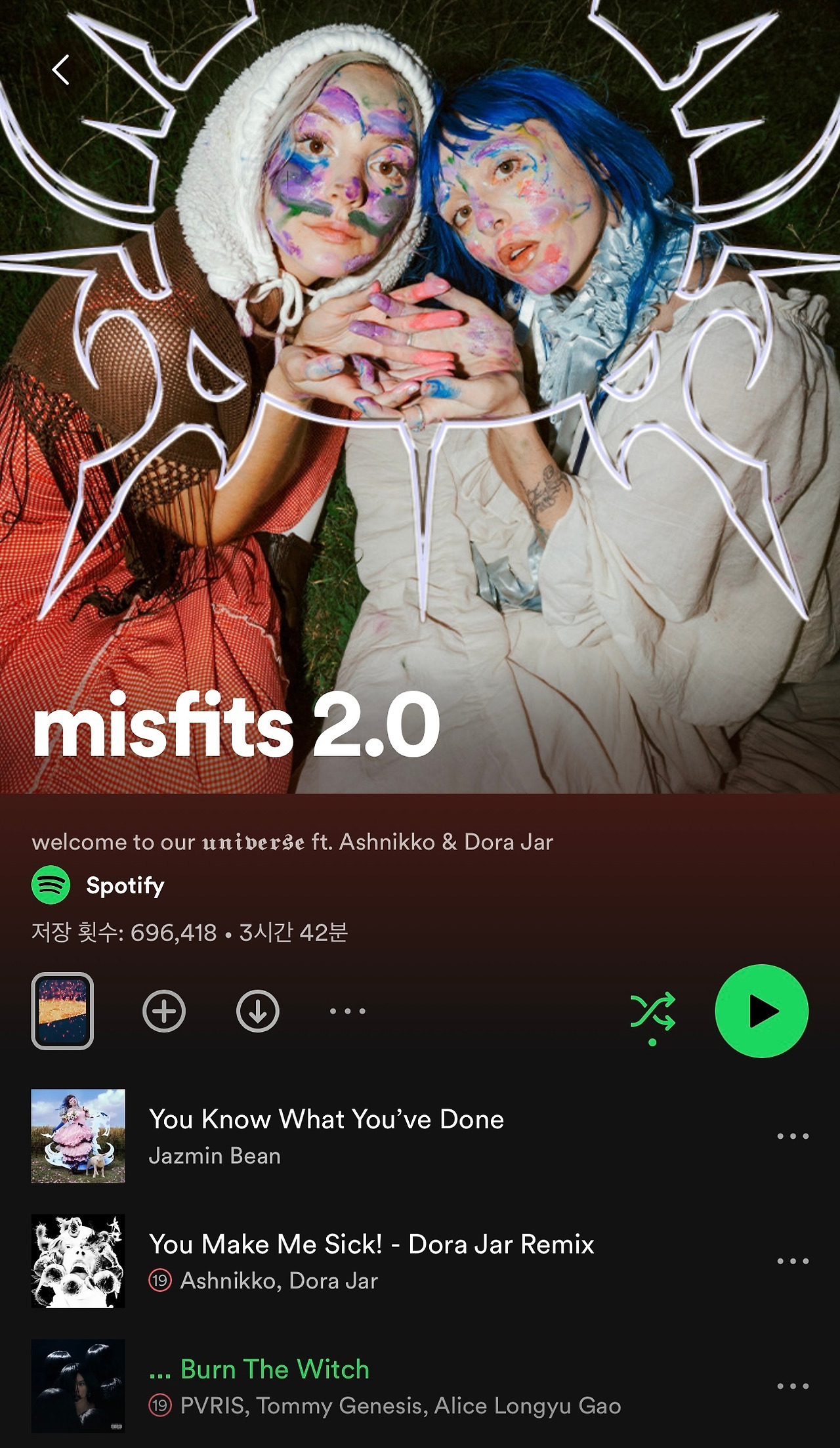 디지털 스트리밍이 음악을 듣는 가장 보편적인 수단이 된 지금, 세계적으로 그 선두주자라고 할 만한 플랫폼은 애플 뮤직과 스포티파이의 양대 산맥일 것이라고 생각한다. 액면상으로 둘은 크게 다를 것이 없어 보이나 사실 리스너에게 어필하는 메커니즘의 측면에서는 미묘한 차이가 있다. 양쪽 모두 한쪽에 없는 기능이 있다거나 다른 쪽에 비해 엄청난 독보적인 강점이 존재하는 것까지는 아니지만 개인적인 경험에 비추어본 바로는 설정을 제대로 해놓은 상태에서는 온전히 하나의 앨범을 처음부터 감상하는 데에는 애플뮤직이, 내 취향에 맞는 음악을 추천받거나 신경 끄고 적당한 플레이리스트를 재생해서 돌려놓고 싶을 때에는 스포티파이가 더 유용하지 않나 생각한다. 특히 스포티파이는 애플뮤직에 비해 플레이리스트의 큐레이팅 면에서 좀 더 해당 유저의 취향에 맞는 음악을 기가 막히게 골라주는 강점이 있는데, 접근성 면에서 월등할 수밖에 없는 애플 뮤직의 존재 하에서도 아직 스트리밍 플랫폼으로서 꾸준히 명맥을 이어가는 이유가 거기에 있지 않을까 싶기도 하다. 스포티파이에서는 주로 락이나 메탈 음악을 많이 듣는 편이었기에 추천받는 플레이리스트도 그런 쪽이 많은 편인데, 며칠 전에 눈을 사로잡은 것이 하나 있었으니 바로 'Misfits 2.0'이라는 재생목록이었다. 새로운 시대의 사회적 부적응자를 의미하는 것인가 싶은 느낌의 제목에 대충 훑어보니 눈에 보이는 아티스트가 Bring Me the Horizon, Yungblud, Poppy 같이 요즘 락 쪽에서 여러 장르를 센스 있게 잘 믹스하는 이들이었기에 흥미를 갖고 재생을 시작했다.