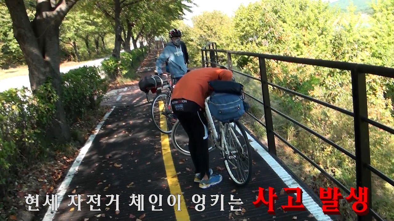 조금 내려가니 모래가 쌓인 곳에 재익이가 앉아 있더라. 무슨 일인가 했더니, 현세가 “재익이 형이 브레이크를 잡지 못하고 날랐어요”라고 말한다. 브레이크의 장력이 생각보다 좋지 못해 속도가 줄지 않아 모래에 부딪힌 것이다. 그나마 모래여서 다행이지, 난간에 부딪히거나 굴러 떨어졌다면 크게 다칠 뻔 했다. 그래서 재익이에게 “괜찮아?”라고 물어보니, 대수롭지 않다는 듯 “날긴 했는데, 살짝 긁히기만 했어요”라고 말하더라. 그곳에선 준영이 자전거에만 디스크브레이크가 장착되어 있어서 타고 내려갈 수 있었고, 나머지는 천천히 끌고 내려가야 했다.