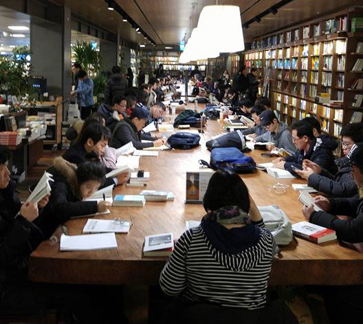 직원이 알려준 위치로 걸어가니 애써 찾으려 하지 않아도 서점과는 어울리지 않는 풍경을 자아내는 곳이 있더라. 도서관이라면 어색하진 않지만, 서점에서의 그런 광경은 무척이나 이상했다. 공간을 엄청나게 차지하는 나무 탁자가 한 공간을 차지하고 있고 거기엔 이미 수많은 사람들이 앉아 책을 읽고 있으니 말이다.