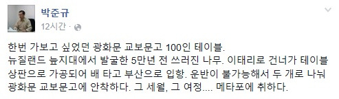 5시에 교보문고에서 만나니, “여기에 5만 년이 된 나무 탁자가 있다는 기사를 얼마 전에 봤는데, 이곳까지 왔으니 한번 봐야지요”라며 직원에게 탁자가 있는 위치를 묻는다. 그 모습이야말로 영락없이 준규쌤 다운 모습이다. 알고 있는 게 많다 보니 어딜 가든 그곳에 대해 사람들에게 충분히 설명해 줄 정도이며, 이처럼 궁금하거나 알고 싶거나, 보고 싶은 게 있으면 한달음에 달려가니 말이다. 그건 적극성이라고 할 수도 있고, 추진력이라 할 수도 있는데, 단재학교에 있을 때 가장 많이 보고 배운 부분이다. 그 모습을 지금도 여전히 볼 수 있으니, ‘준규쌤은 여전하시구나’라는 생각이 들어 기분이 좋았다.