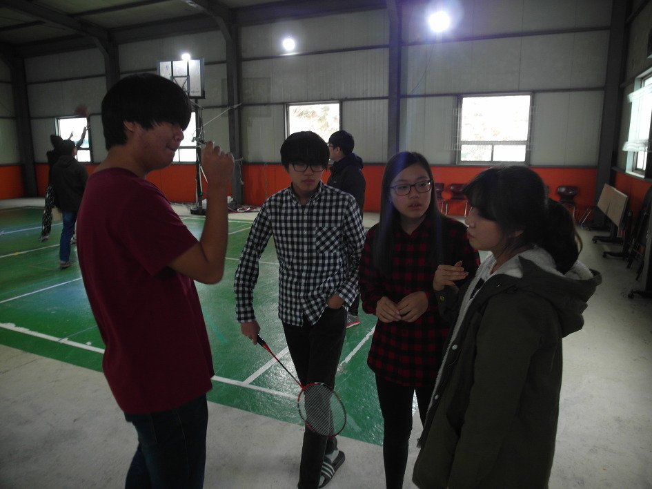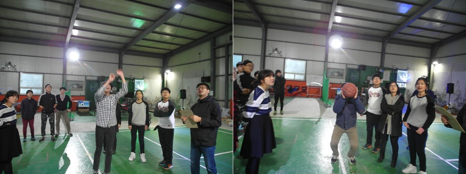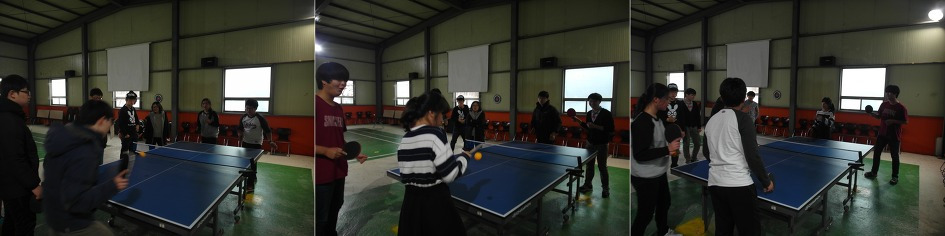 보물찾기 후엔 간식을 나눠먹고 바로 체육관으로 이동했다. 오늘 종목은 탁구, 배드민턴, 이인삼각&삼인사각, 농구 자유투, 노래 부르기의 5개 종목으로 진행되었다. 각 팀당 교사 한 명에 학생이 4명씩으로 구성되어 있기 때문에 탁구와 배드민턴엔 각각 2명씩 참가(중복 참가불가, 교사 참가 불가)하여 게임을 진행하되 각 팀당 2번의 경기를 치러 등수를 정하고, 농구 자유투는 개인 당 5개(연습 2개)씩 던져 팀별 합산을 하여 등수를 정하며, 이인삼각은 두 명의 학생이, 삼인사각은 두 명의 학생과 교사(이 또한 중복 불가하며 이인삼각에 3점, 삼인사각에 3점이 부여됨)가 참여하여 먼저 골인하는 팀부터 등수를 정하고, 노래 부르기는 각 팀 당 2곡(듀엣도 가능)을 불러 점수를 합산하여 등수를 정한다. 여기서 획득한 점수를 총합하여 최종 등수를 정하고 2등과 3등은 벌칙을 받게 된다.