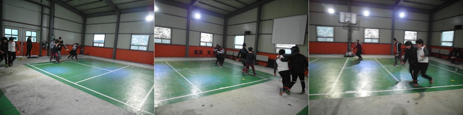 삼인사각은 승태팀에선 승빈과 상현이가, 초이팀에선 현세와 지민이가, 건빵팀에선 민석이와 지훈이가 나왔다. 아무래도 이 경기에선 남학생들과 남선생이 끼어 있는 승태팀과 건빵팀이 유리할 수밖에 없었다. 더욱이 건빵팀은 민석이와 지훈이가 함께 참여하는 것이니, 박자만 잘 맞추면 오히려 승산이 크다고 할 수 있다. 처음엔 다리가 꼬였지만 규빈이가 박자를 정해주고 여러 번 맞추고 나니, 직접 걷는 것처럼 편하게 걸을 수 있었고 코너에선 저글링처럼 바닥을 질질 끌며 돌면 되었다. 삼인사각은 그래도 이인삼각처럼 뛰거나 할 수는 없었기에 천천히 돌며 좀 느긋하게 게임을 할 수 있었다.