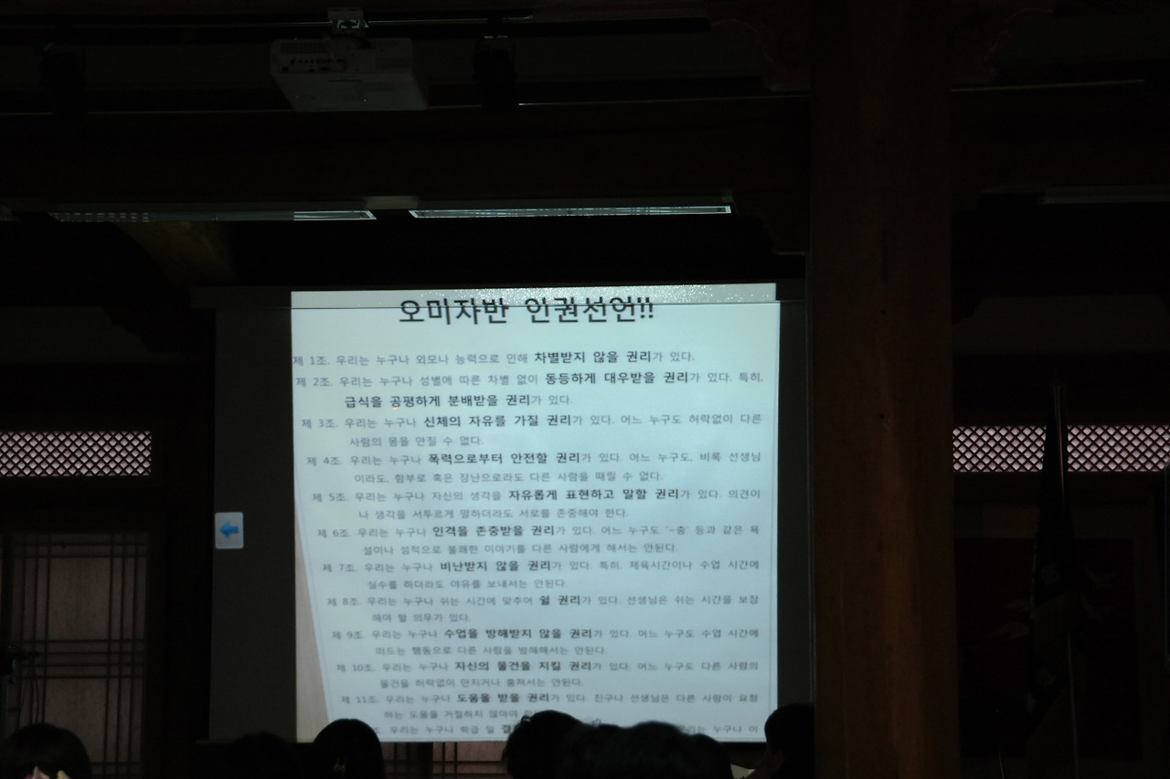 학생의 인권을 중시한다는 건 힘든 일일 수밖에 없다. 단재학교는 10여명의 아이들이 함께 생활하는 곳이기에 시작과 함께 규칙도 만들고 중간에 수정하는 것 또한 자유롭지만, 일반 학교의 경우 학생 수가 25명 이상이 되다 보니 수많은 난관이 있을 수밖에 없다. 그럼에도 아이들 앞에서 함께 선언을 하고 규칙을 만드는 것이기에 대단하다고 할 수 있다.