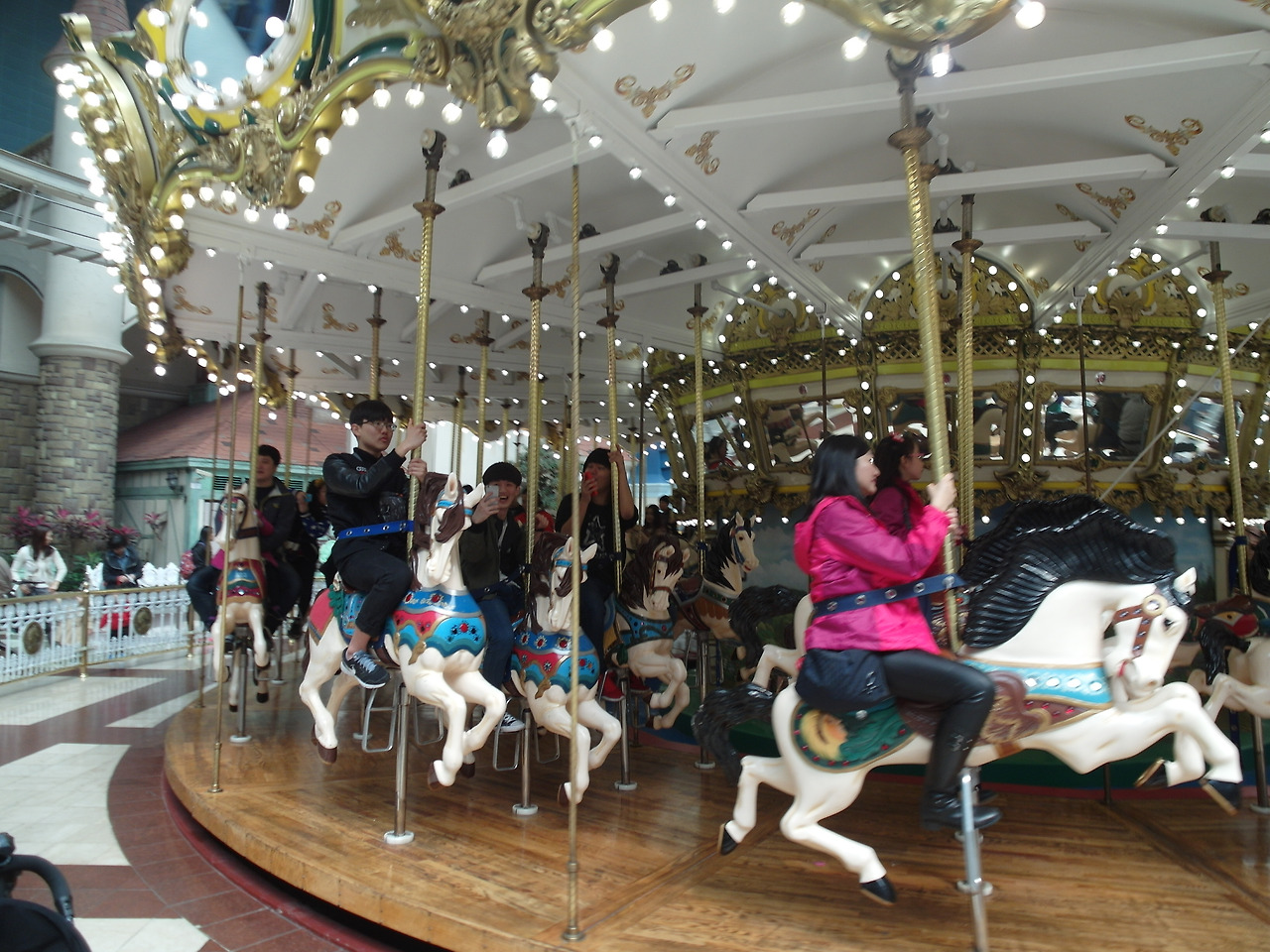 점심을 먹기 위해 다시 실내로 들어왔다. 우린 회전목마 옆에 있는 햄버거 가게에 자리를 잡았더니, 나머지 아이들은 그 시간에 회전목마를 타고 있더라. 세 남학생들이 나란히 앉아 회전목마를 타는 모습은 어느 곳에서도 볼 수 없는 매우 신선한 모습이었다. 그리고 오전 내내 거의 코빼기도 못 보다가 이렇게 보니 반갑기도 했다. 회전목마를 다 탄 후 햄버거를 같이 먹자고 하니, 아이들은 그걸 보더니 ‘밥을 먹으러 가자’고 말하더라. 그래서 점심도 서로 나누어져 먹게 되었다.