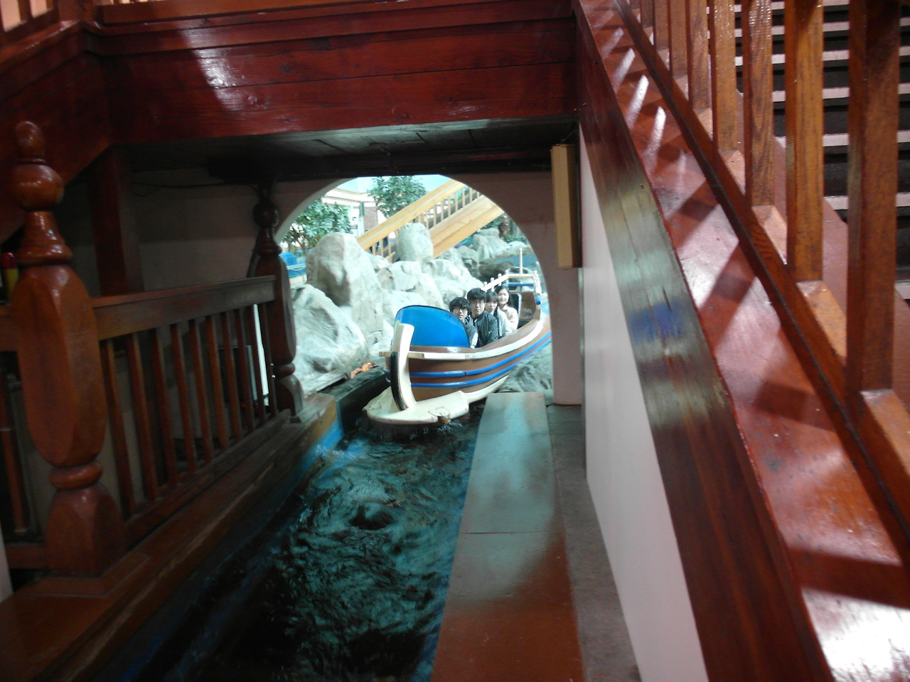 그 다음에 타러 간 것은 후룸라이드다. 정글을 탐험하는 듯한 느낌의 놀이기구로 4명이 한 팀이 되어 탈 수 있다. 대부분은 길에 흐르는 물을 따라 가다가 두 번 높은 곳에서 떨어지며 스릴을 느낄 수 있다. 하지만 문제는 놀이기구가 지나는 길엔 물이 흐르고 있다는 점이다. 그러니 높은 곳에서 떨어지면 당연히 물이 튀게 마련이고 앞에 있는 사람들은 물바가지를 뒤집어 쓸 수밖에 없다. 예전에 탔던 기억으론 그렇게까지 물이 많이 튄다는 생각이 없었기에, 그냥 편안하게 탔는데, 운이 좋게도 뒷좌석에 앉았다. 그래서 떨어질 때 보니 앞 사람들은 튀는 물에 완전히 생쥐꼴이 되어 있더라. 그걸 보고 나니, ‘역시 후룸라이드는 뒷좌석이 스릴을, 물에 젖을까 두려워하기보다 시원하다는 느낌을 느낄 수 있는 곳’이라는 생각이 들었다.