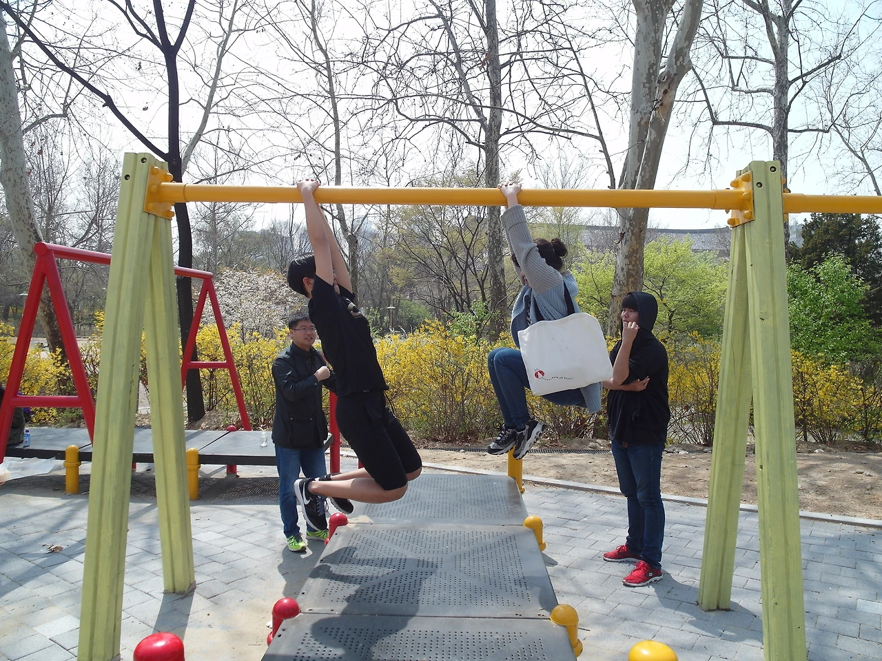 삿갓을 뒤집어 놓은 것 같이 생긴 그네도 타고, 철봉 같은 곳에 매달려 서로 떨어뜨리는 게임도 하며, 철봉에 거꾸로 매달리기도 했다. 그곳에서 노는 그 순간은 ‘역사적인 아이’가 되는 순간이라 감히 말할 수 있을 정도였다.