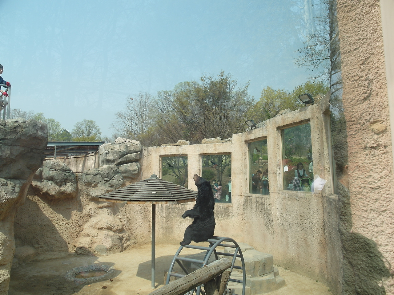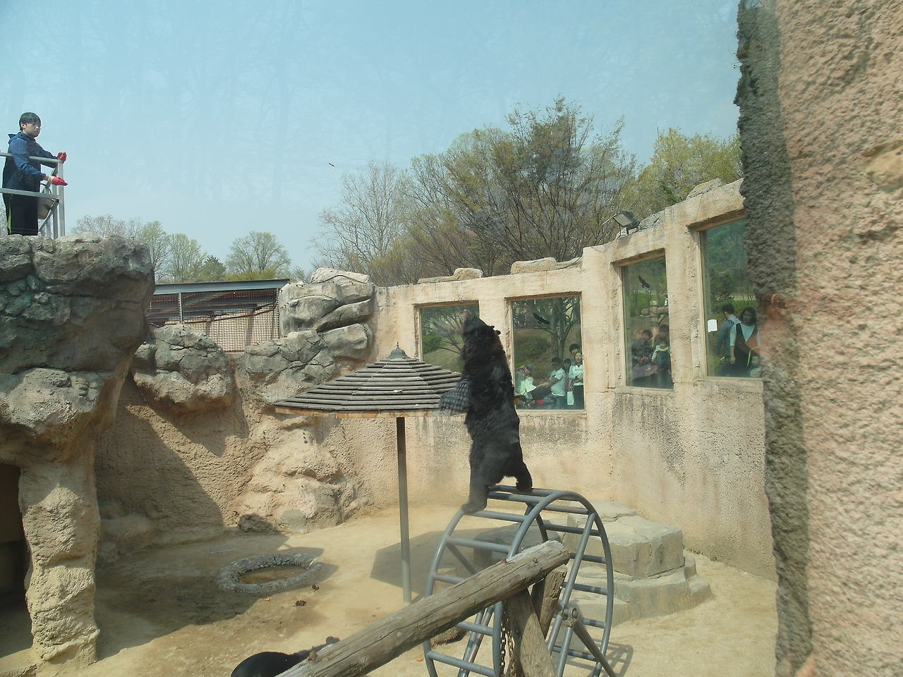 그 다음엔 맹수들이 사는 곳을 지나쳐 가는데, 그 때 재밌는 장면이 연출됐다. 식사시간이 되었는지 사육사가 먹이를 주며 곰을 훈련하고 있었기 때문이다. 사육사는 사육장 꼭대기의 안전한 곳에 올라가 곰에게 먹이를 보여준다. 그러니 곰은 먹이를 따라 철제구름다리 같은 곳에 오른다. 그 때 사육사는 손을 위로 올리며 일어서라는 제스처를 취하고, 그에 따라 곰은 중심을 잡고 일어선다. 그 모습을 보고 사육사는 먹이를 던져주고 곰은 그 먹이를 한 번에 받아먹는다.