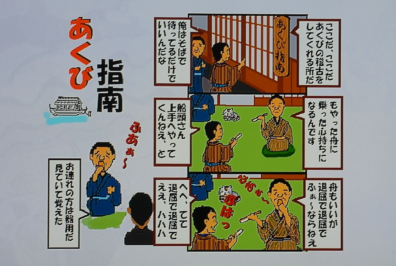 하품을 수련한다. 현실에선 그럴 리가 없지만, 이건 어디까지나 픽션을 통해 현실을 풍자하기 위한 것임을 상기할 필요가 있다. 하품을 수련하기 위해 두 명의 학생이 하품의 달인인 노인을 찾아 가서 “하품을 가르쳐주십시오”라고 강단 있게 말한다. 하지만 두 명의 학생 중 한 명은 하품에 대해 전혀 관심은 없지만, ‘뭐라고 설명할 방법이 없지만 그냥 끌리네’라는 심정으로 친구를 따라 왔다.
