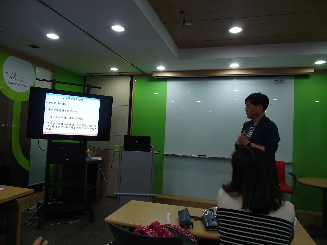 예전 같으면 이런 경우 버럭 화를 내며 “그런 말도 안 되는 소리 그만 하고 그냥 수업에 들어가!”라고 말했을 것이다. 물론 지금도 끊을 땐 끊는 게 나쁘다고는 생각하지 않는다. 하지만 그럼에도 조금 달라진 부분은 지금처럼 ‘차이가 주는 긴장’상태에 놓였을 때, 상황에 따라 좀 더 유연하게 대처하게 되었다는 점이다. 그래서 학생의 말을 듣는 순간, 부글부글 끓어오르는 화는 가라앉히고 천천히 대화를 하기 시작했다. 그래야만 권위에 의지하거나, 해결책을 찾아 거래하려는 어리석은 행동을 하지 않게 되니 말이다. 2시간 정도 얘기를 나눴지만, 나의 생각이 학생에게 가닿을 순 없었다. 그럼에도 그 시간동안 치열하게 서로의 입장을 듣고 얘기할 수 있었던 것은 좋은 경험이라 할만했다.