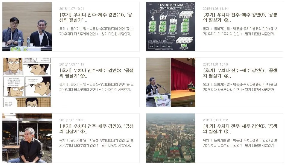그렇게 간단하게 써지던 후기는 작년 우치다쌤의 전주-제주 강연의 노검파일을 듣고 후기를 남기게 되면서 일대변혁이 일어났다. 전주 강연은 2편으로 후기를 쓸 수 있었고, 제주 강연은 무려 6편의 후기를 쓸 수 있었으니 말이다. 그 때 이후로 다른 강의를 듣고 후기를 쓰더라도 짧게는 3편에서 6편까지 후기를 남기게 되었다. 아마도 이런 식으로 강의 후기를 남기는 것에 자신감도 생기고 탄력도 받다보니, 이번에도 ‘연강이면 어쩌랴, 그걸 모두 남기면 그 뿐인 것을’이라는 ‘자뻑’스런 계획을 세우기에 이르렀다.
