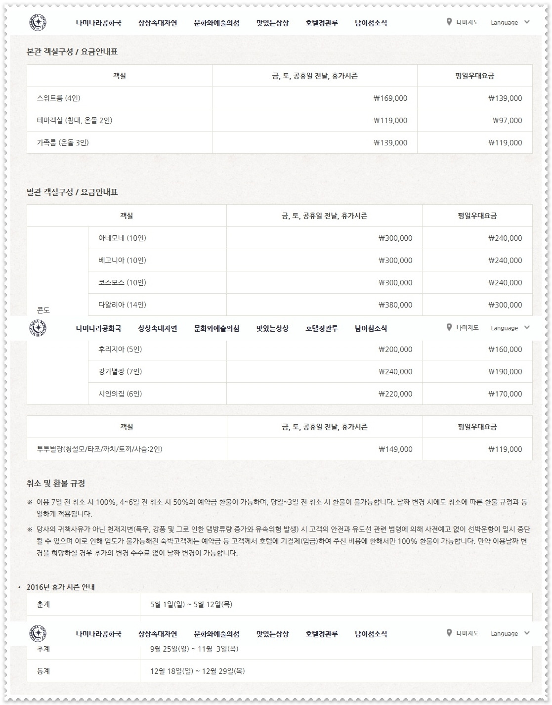 남이섬에서 숙박하기 위해선 정관루라는 호텔이나 우리와 같이 인원수에 맞도록 만들어진 콘도를 예약해야만 한다. 호텔은 콘도에 비해 약간 저렴한 편이고, 콘도는 하나하나 개별 건물이기에 조금 비싼 편이다.