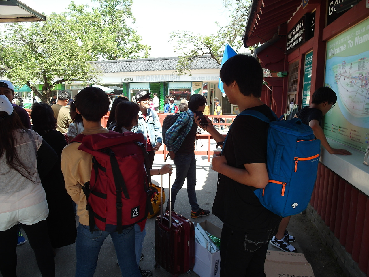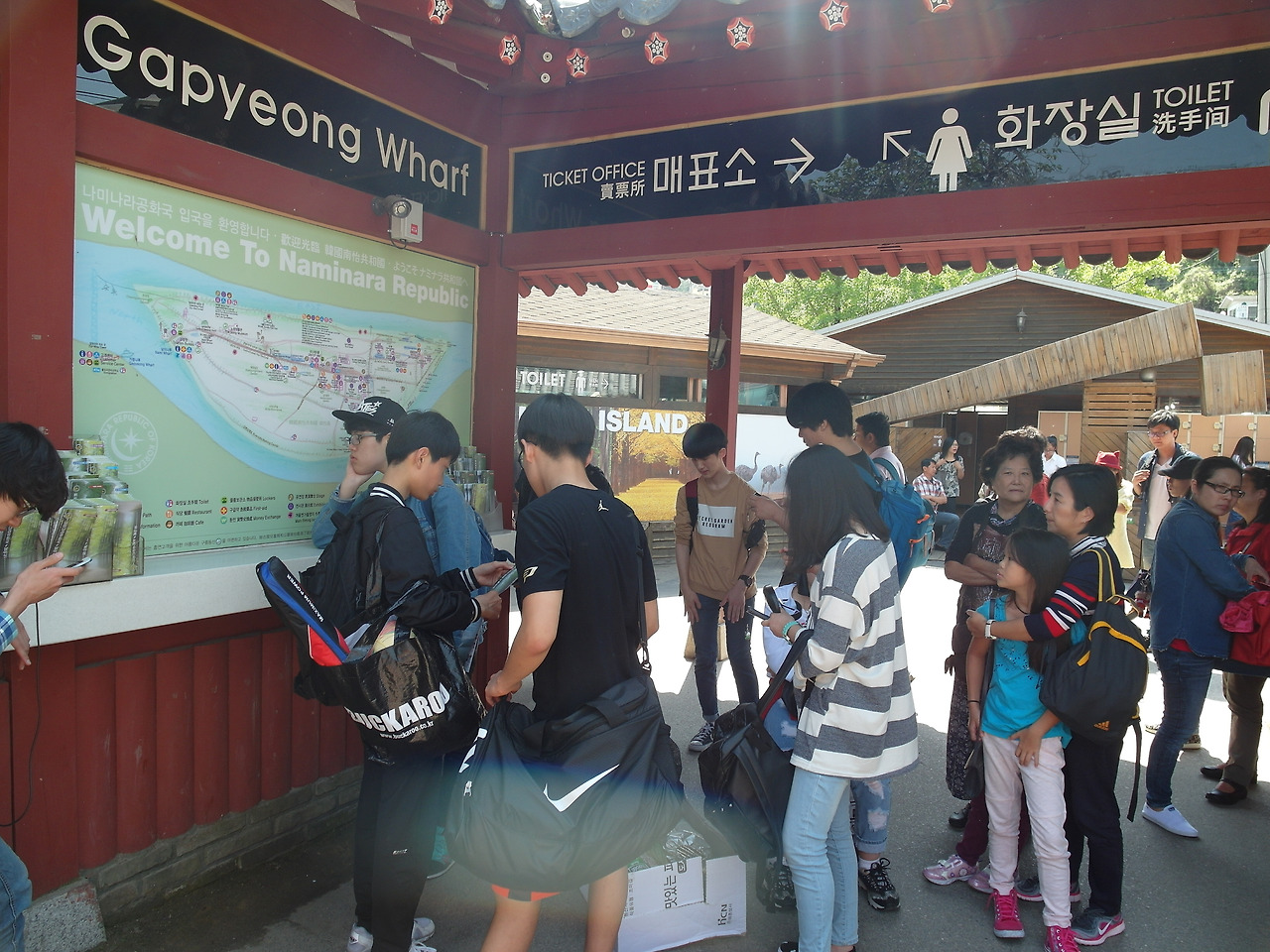 두 손 가득 짐을 들고 남이섬가평 선착장으로 걸어간다. 선착장 주차장엔 관광버스들이 즐비하다. 얼마나 많은 관광객들이 있을지 걱정과 기대가 동시에 된다. 선착장에 들어서니 한옥풍의 건물이 보이고 ‘사람떼’라 부를 수 있을 정도로 많은 사람들이 보인다. 역시나 유명 관광지답게 내국인부터 외국인까지, 여행객부터 수학여행을 온 학생까지 다양한 사람들이 있다.