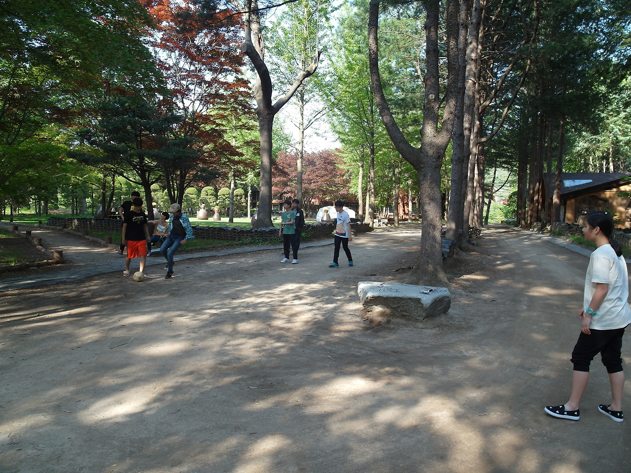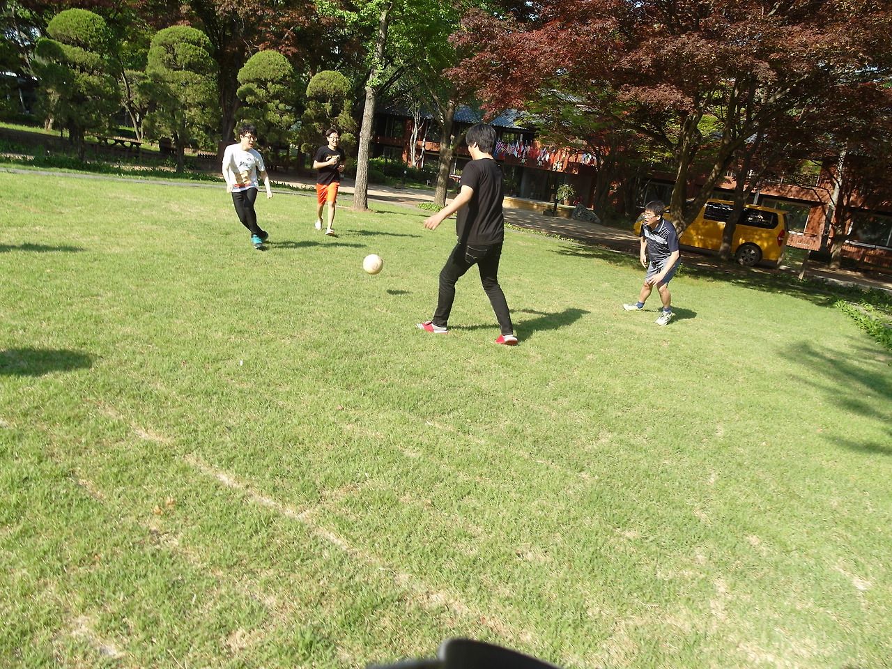 이런 모습을 보고 있던 승태쌤은 아예 팀을 짜서 미니 축구를 하자고 제안했다. 그러자 여학생들과 준영이는 쉬고 싶다며 하지 말자고 했고, 그 외의 학생들은 의외로 순순히 게임을 하자고 했다. 더욱이 평소에 ‘축구를 좋아한다’고 말하던 상현이까지 같이 하게 됐으니, 4월에 런닝맨 게임을 한 이후 가장 많은 인원들이 단체운동을 하게 된 셈이다. 그래서 우린 콘도 바로 옆에 있는 잔디로 자리를 옮겨 골대를 세우고 자리를 세팅했다.