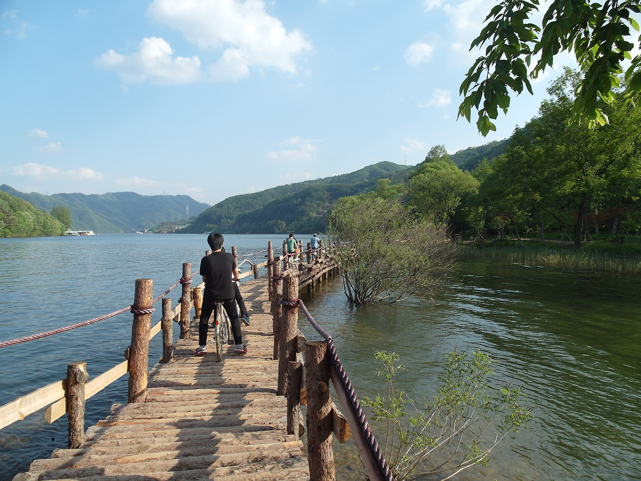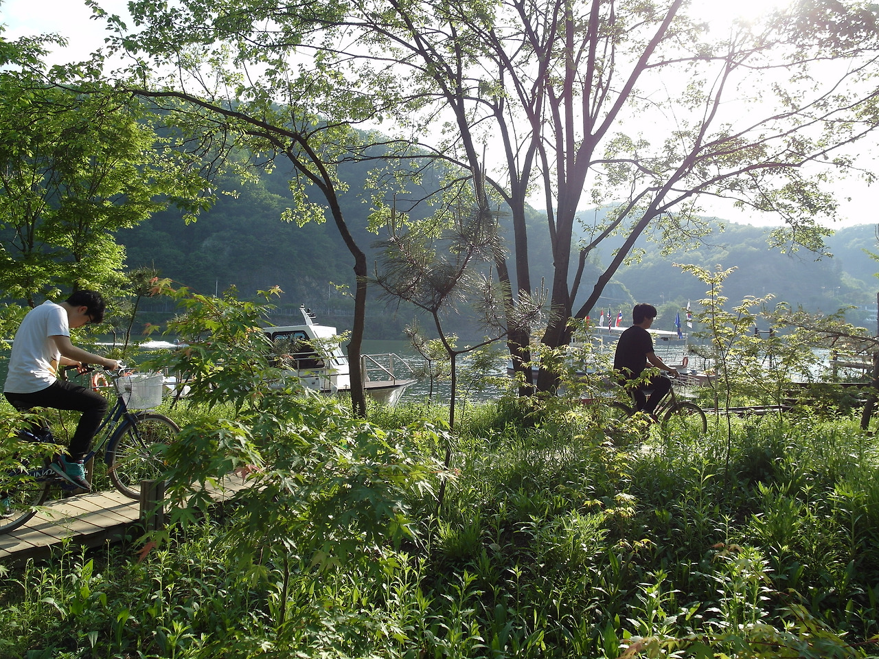 한참을 달려 남이섬 남쪽 끝까지 달리면 통나무다리가 놓여 있다. 강 위로 설치된 통나무다리를 건너는 맛은 꼭 자연 속으로 파고 들어가는 느낌이었다. 비록 자전거를 타고 건널 수는 없기에 끌고 가야 하지만, 통나무 다리를 건너는 느낌은 어느 것에도 비할 수 없을 정도로 좋았다.