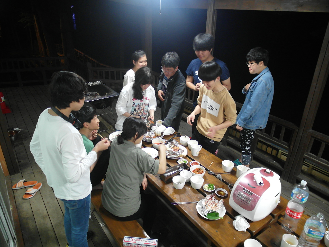 그곳에서 아이스크림을 하나씩 먹고 천천히 걸어서 콘도로 돌아왔다. 그리고 곧바로 저녁 준비를 하기 시작했다. 오늘 저녁은 고기파티다. 단재학교에서 단체여행을 갈 때면 숯불을 피우고 고기를 구워서 함께 먹는다. 아무래도 소 한 마리도 거뜬히 먹을 수 있는 왕성한 식욕의 청소년들과 함께 여행을 하는 것이다 보니 이런 식의 푸짐한 고기파티는 결코 빠질 수가 없고, 아이들도 여행하면서 가장 기대하는 시간이라 할 수 있다.