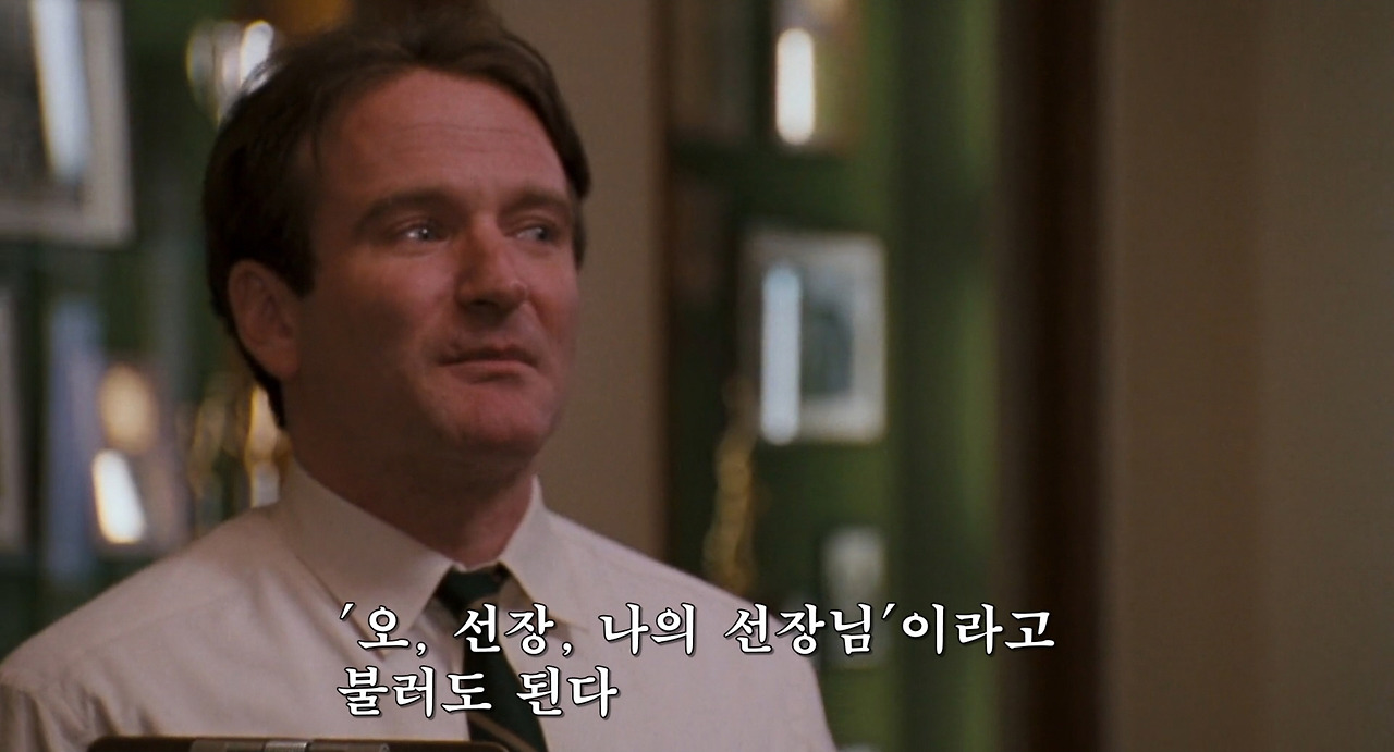 박물관에 모인 학생들에게 키팅은 자신을 이제부터 “Oh! Captain! My Captain!”이라 부를 것을 제안한다. 그건 중요한 의미가 있다. 자신을 존경하지 않음에도 교사의 권위만을 내세우며 억지 존경을 보이라고 강요하는 게 아니라, 존경하는 마음이 생길 때 그런 명칭을 불러주라는 얘기이기 때문이다. 물론 여기서 어떤 명칭을 부를까 선택할 수 있는 주체는 교사가 아닌 학생들이라 할 수 있다.