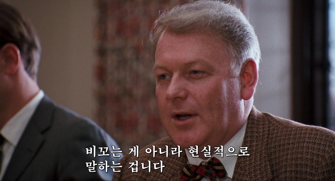 그런데 키팅의 이런 수업은 명문학교란 현실과 부딪힐 수밖에 없다. 그리고 당연히도 키팅의 교육관은 비현실적인 것으로 폄하되고, 그런 수업들은 ‘방향은 틀렸어도 사로잡을 만’한 하나의 쇼로 치부된다. 라틴어 교사인 맥칼리스터와의 대화에서 어떤 갈등이 빚어지는지 볼 수 있다.