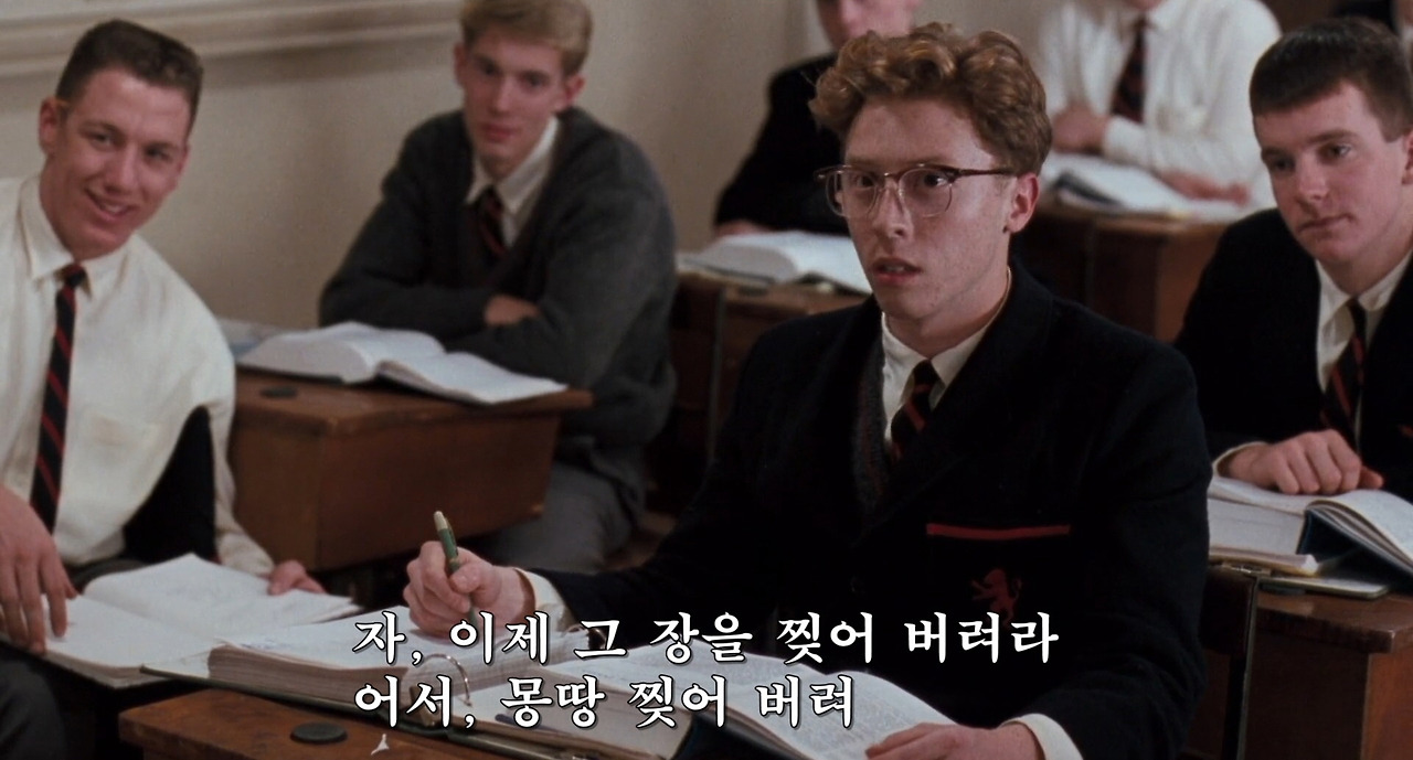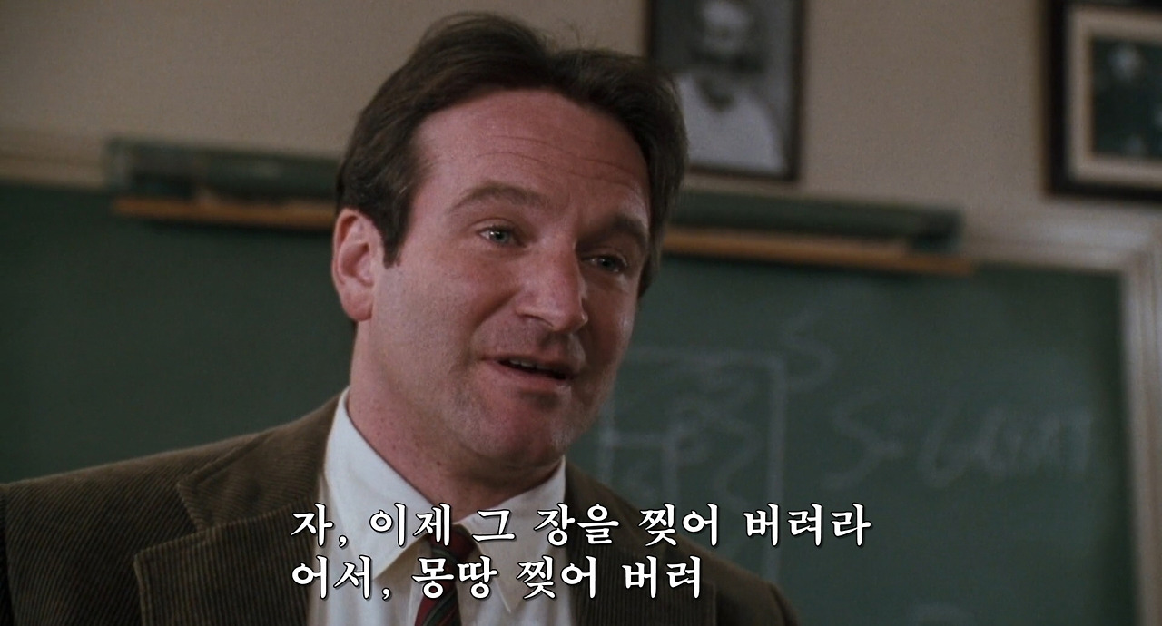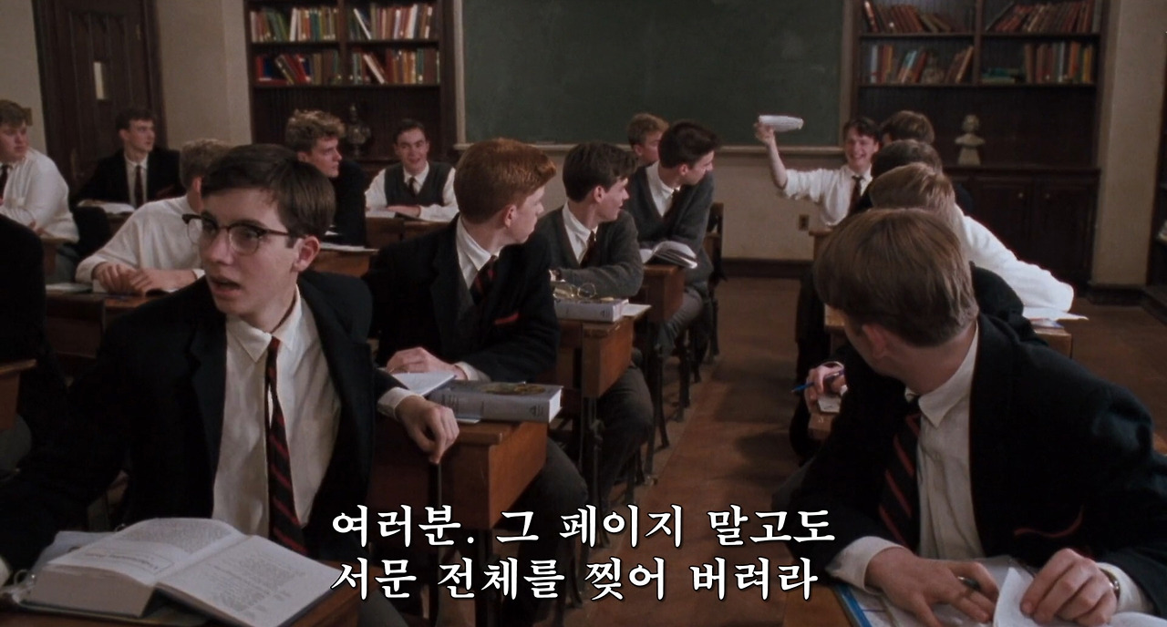 지금은 많이 나아졌지만 내가 학교 다닐 때만해도 교과서에 낙서를 한다거나, 교과서를 비판한다는 것은 있을 수도 없었다. ‘교과서=진리’라는 생각이 있었기에, 익히고 받아들여야만 한다고 생각했다. 이러하니 교과서를 찢는다는 건, 매우 불경스러운, 그래서 양심의 가책까지 느껴지는 일이었던 것이다. 내가 학교 다닐 때도 그랬는데 1950년대가 배경인 이 학교의 학생들에게 키팅의 말은 장난처럼 들릴 수밖에 없었을 것이다. 그래서 머뭇거렸고, 달튼이 먼저 행동하기 전까진 누구 하나 찢을 엄두조차 내지 못했다.