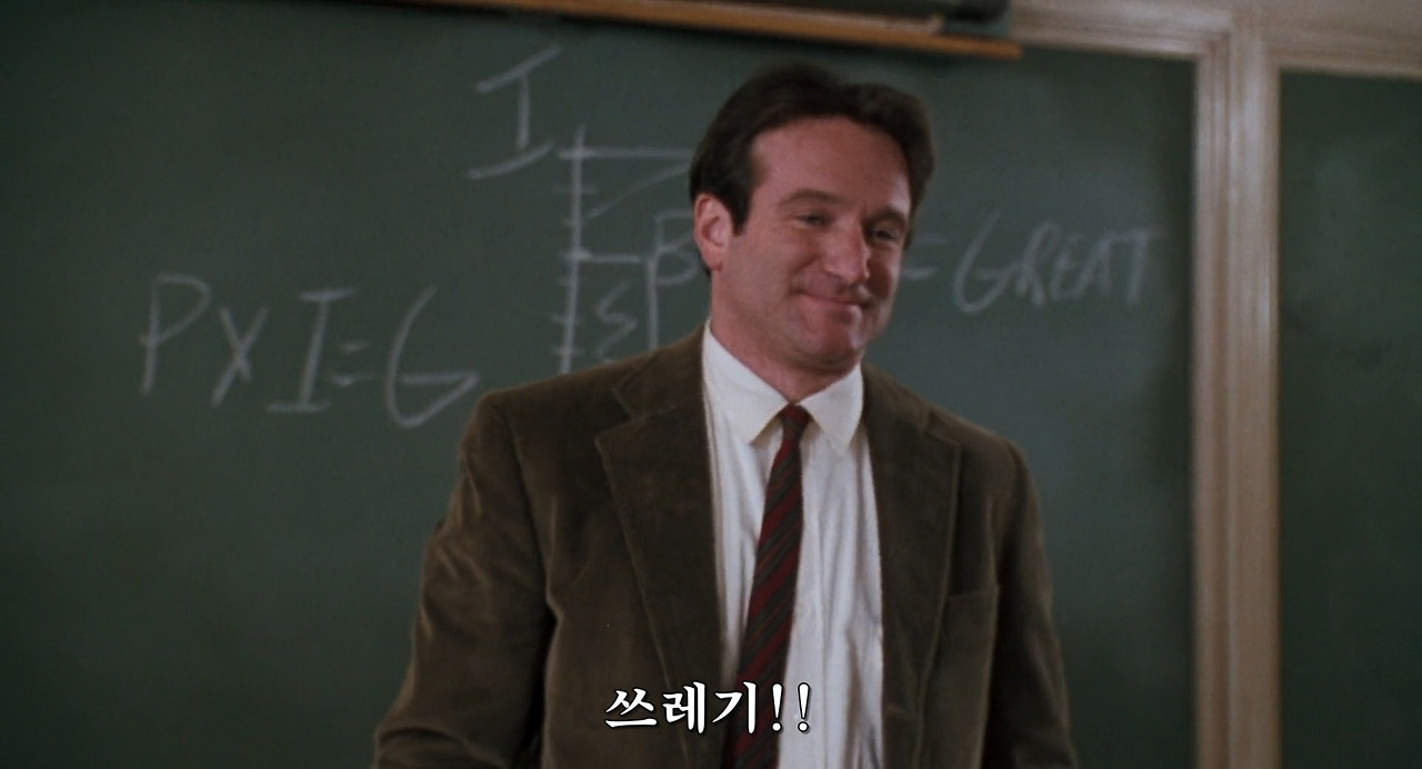 평범한 수업처럼 교과서를 펼쳐들고 서문에 쓰여 있는 ‘시의 이해’를 공부한다. 닐에게 읽으라고 한 후, 키팅은 책의 내용을 도식화하여 칠판에 그린다. 시를 평가하기 위해선 ‘대상의 표현도’와 ‘대상의 중요도’와 같은 두 가지 항목으로 수치화하여 그 점수를 곱하면 작품의 완성도가 된다는 것이다. 그때 높은 점수가 나오면 훌륭한 작품이고, 낮은 점수가 나오면 저속한 작품이라는 설명이다. 키팅이 칠판에 그린 그림을 학생들도 열심히 따라서 그린다. 이런 모습만 보면 학교에서 일상으로 이루어지는 수업과 하등 다를 바가 없어 보인다. 그래서 이쯤 되면 ‘에이 뭐야~ 너무 똑같잖아. 역시 첫 수업만 이상하게 해서 낚은 거네’라는 반응이 절로 나올 법도 하다.