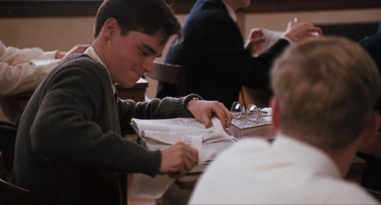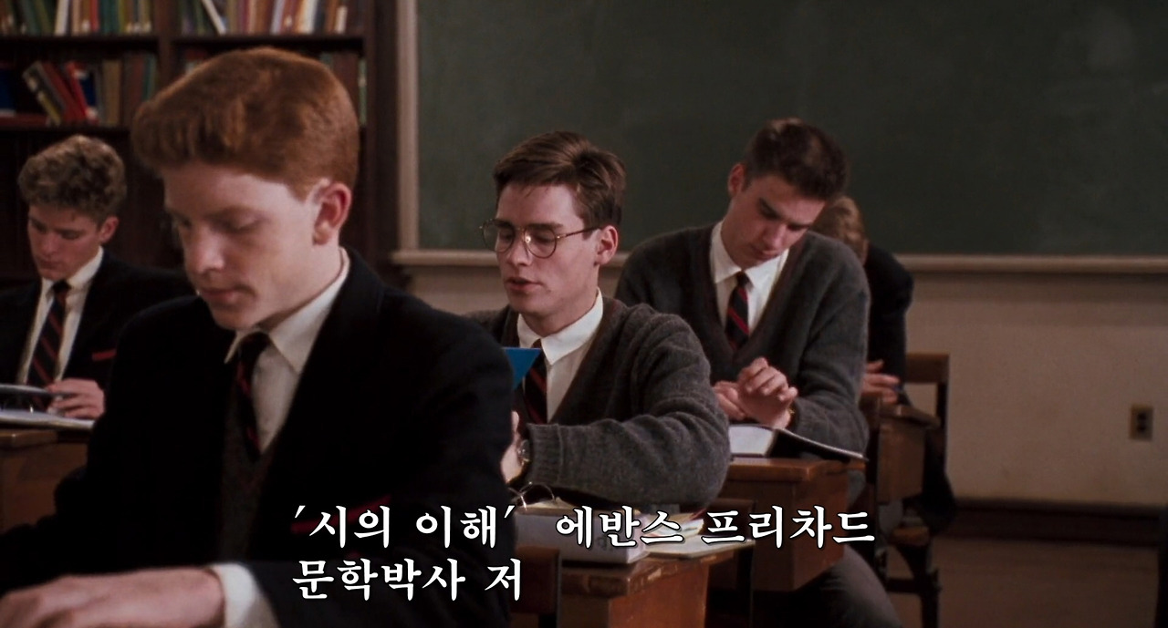 두 번째 수업이 시작되며 학생들은 정자세로 앉아 있고 키팅도 교사용 책상에 앉아 있다. 학교에서 가장 익숙히 보아오던 광경이다.
