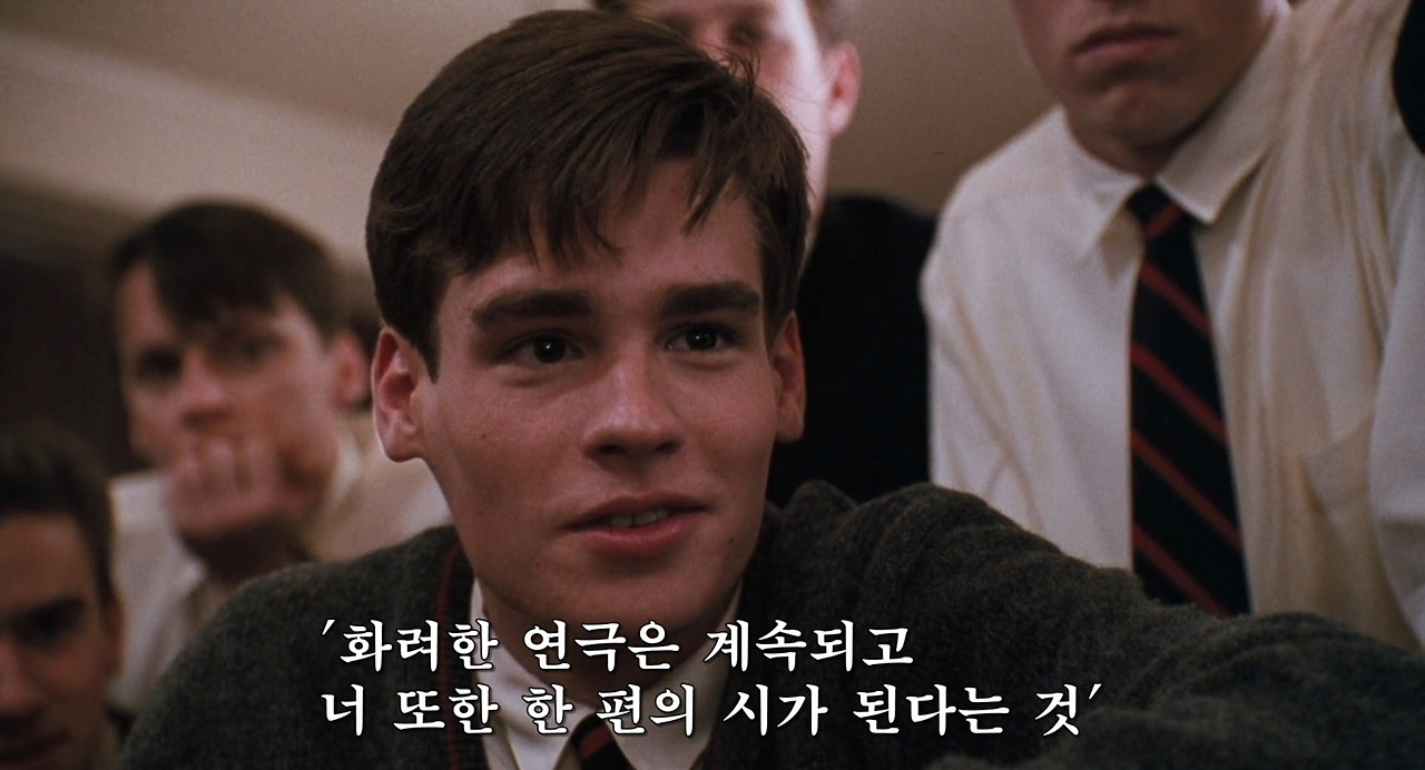 기쁨의 들뜬 학생들 사이로 키팅은 파고 들어가 ‘진정한 시의 이해’에 대해 말하기 시작한다. “시가 아름다워서 읽고 쓰는 것이 아니다. 인류의 일원이기 때문에 시를 읽고 쓰는 것이다. (중략) 시와 미, 낭만, 사랑은 삶의 목적인 거야”라고 말이다. 그러면서 ‘바로 너 자신이 시가 된다’는 내용을 지닌 휘트만의 시를 인용하며 마무리 짓는다. 그 순간 닐과 토드의 얼굴엔 무언가 강렬한 깨달음이 온 것 같은 의미심장한 표정이 어린다.