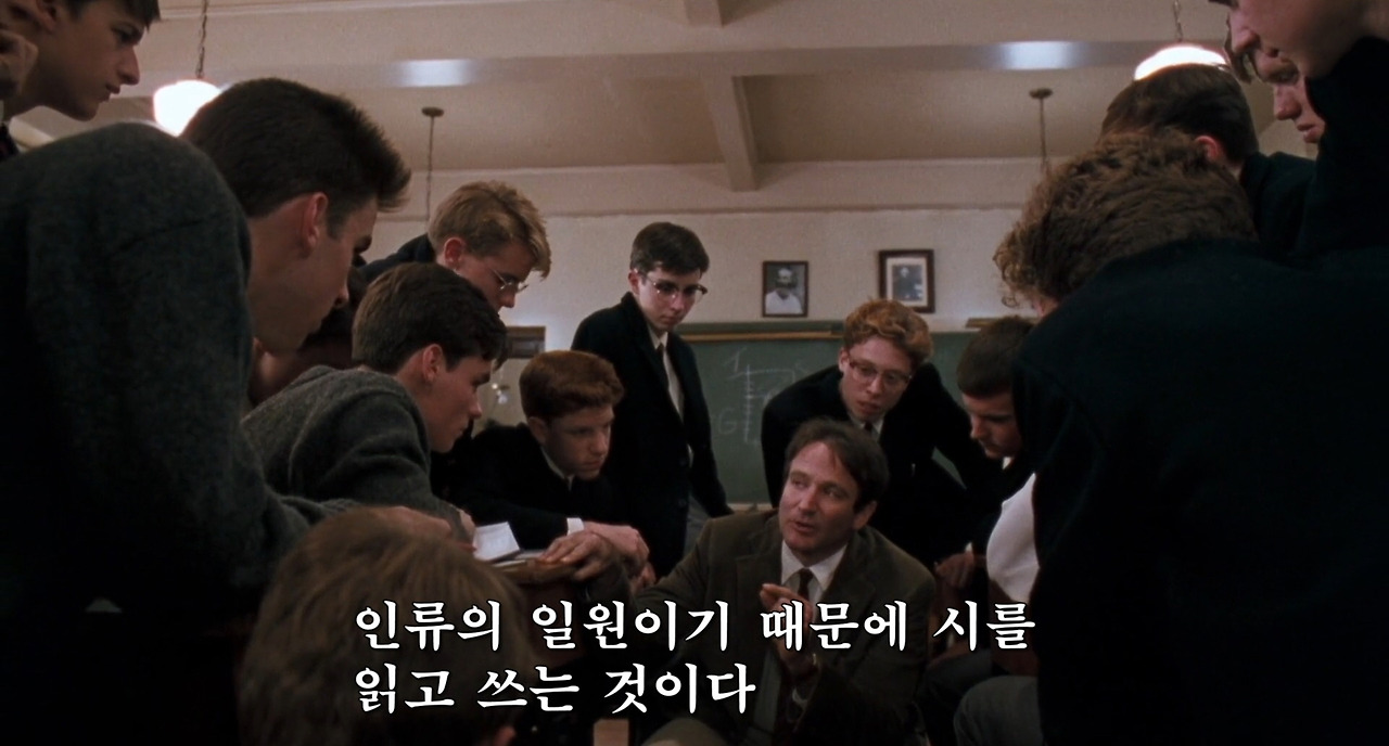 서문의 ‘시의 이해’는 어디까지나 시를 어떻게 분석하고 평가할 것인가를 다루고 있었다면, 키팅의 ‘시의 이해’는 너 자신이 시가 될 수 있다는 사실을 알려줬다. 이때 키팅은 교탁에서 내려와 책상 주위에 쭈그려 앉아 학생들의 눈높이에 맞춰 이야기를 하고 있었는데, 그건 수업을 한다기보다 이야기를 나누고 있다는 표현이 맞을 것이다. 키팅이 말한 ‘시의 이해’를 신영복 선생의 언어로 풀면, “시는 세계를 인식하고 재현하는 상투적인 방식을 전복하고, 상투적인 언어를 전복하고, 상투적인 사유를 전복하고, 가능하다면 세계를 전복하는 것, 이것이 시인의 카타콤이며 그 조직 강령이라고 하고 있습니다. (『담론』, 26쪽)”이라 할 수 있다. 키팅이 말하는 시의 정의와 신영복 선생이 말하는 시의 정의는 깊은 곳에서 일맥상통한다.