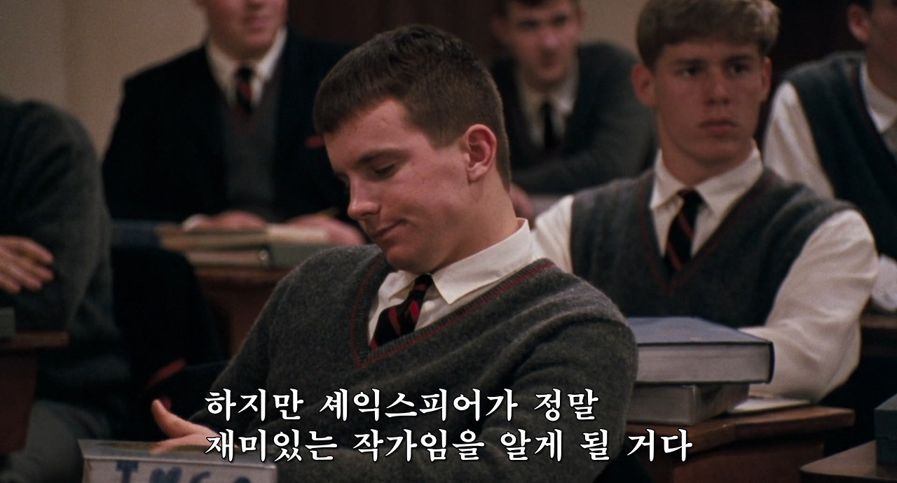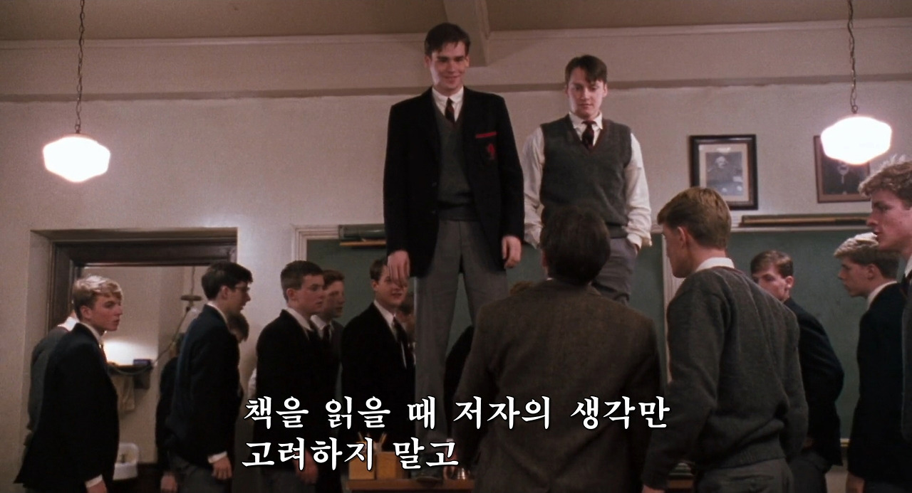 키팅은 학생들과 시를 이야기한다. 나 또한 학교를 다닐 때 시는 어렵고 난해하며 도무지 이해할 수 없어서 끔찍이도 싫어하던 과목이었듯이, 이 학교의 학생들도 별반 다르지 않았나 보다. 하긴 시험을 보기 위해, 정답을 맞히기 위해 시를 배우고 있으니, 키팅이 “오늘 우리는 세익스피어의 시를 배우도록 하겠다”라고 했을 때, 끔찍한 표정을 짓는 건 당연했다. 이럴 때 우린 농담조로 ‘XXX만 태어나지 않았어도 이런 공부는 안 해도 됐을 텐데’라고 말하듯, 그들 또한 이렇게 죽도록 공부하게 만든 원흉(?)인 세익스피어에 대해 미워하는 마음이 있었을 것이다.