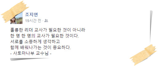 하지만 그러면 그럴수록 과유불급이 된다는 점이 문제다. 그래서 준규쌤은 교컴수련회 때 “너무 열심히 하려 하지 마세요. 그저 잘리지 않을 정도로 하면 되거든요. 차라리 열심히 하고자 하는 열정을 다른 곳에 퍼부으시고 자기가 하고 싶은 일을 하세요.”라고 말했던 것이다. 누구나 그렇지만 애정을 쏟은 만큼, 심혈을 기울인 만큼 그에 따른 결과나 변화가 나타나길 기대하게 된다. 하지만 그런 결과가 나오지 않을 땐 교육에 대해 회의하고, 학생에 대해 절망하게 된다. 그러니 학생에게만 포커스를 맞추려 하기보다 다양한 것들에 관심을 갖고 교사 자신의 삶을 아름답게 가꿔 나갈 수 있어야 한다. 그럴 때 자연스럽게 학생들에게 훈습되는 것이니 말이다.