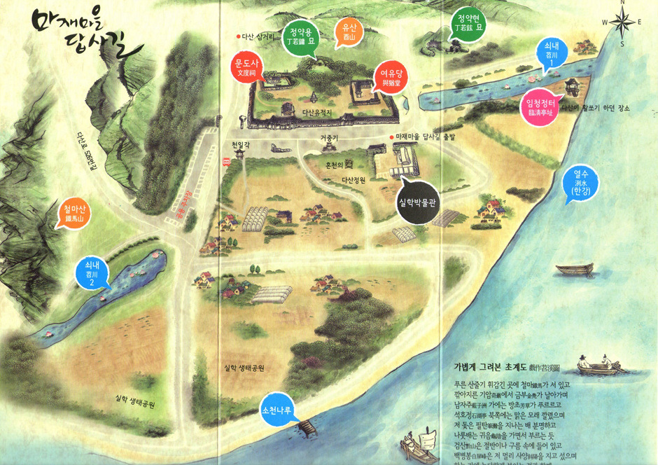 마재는 정약용丁若鏞(1762~1836) 형제가 나서 자란 곳이다. 마재는 남한강의 굽이치는 절경 속에 우뚝 튀어나온 곳에 자리하고 있다. 지형상으로 특이한 모습이다 보니, ‘이곳이야말로 비범한 인물이 나올만한 장소’라는 느낌을 자아낸다. 물론 이런 해석은 다산이 이미 유명한 사람이기에 결과에 껴 맞춘 것에 불과하지만, 그럼에도 분명한 것은 이런 곳에 살다보면 대자연을 그 느낌 그대로 받아들이며 깊은 심성에 자리하게 한다는 점이다. 아마도 바로 이와 같은 환경이 어린 다산의 정서에 큰 영향을 끼쳤으며, 그래서 ‘애절양哀絶陽’과 같은 가슴 절절한 문장을 구사하게 만들게 했다는 것이다.