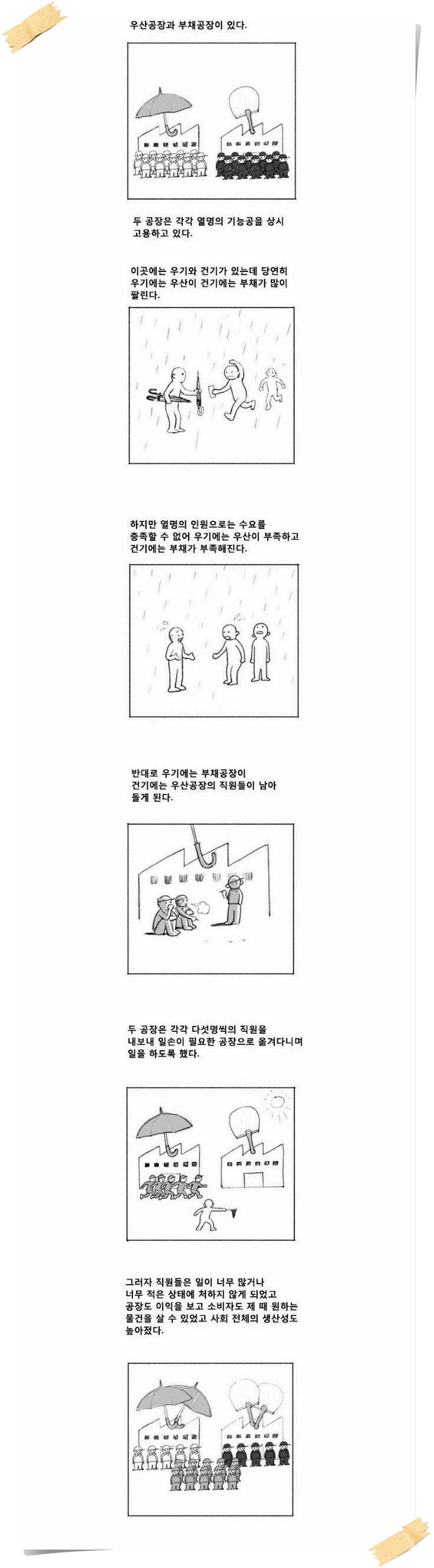 왜 경제계는 획일적인 욕망을 추구하는 사회를 원한 것일까? 일할 사람이 많아 인건비가 떨어지면 당연히 제조단가가 떨어지고, 그에 따라 기업의 이윤은 증가한다. 더욱이 이때 소비자의 욕망이 똑같으니 같은 상품에 대한 수요까지 높아져 매출증대로까지 이어진다. ‘일할 사람↑ ⇒ 인건비↓ ⇒ 제조단가↓ ⇒ 이윤↑’, ‘수요↑ ⇒ 공급 그대로 ⇒ 매출↑’이란 공식으로 기업은 어떻게 하더라도 이익을 보는 구조가 만들어진 것이다.