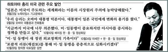 자민당 일당 독재에 가깝던 일본에서 54년 만에 평화적인 정권 교체가 이루어지며 하토야마 정권이 탄생했다. 정권이 바뀐 만큼 지금까지의 강경노선에서 탈피하여 유화적인 제안을 하기에 이른다. 하나는 미군 때문에 몸살을 앓고 있는 오키나와의 미군 기지들을 축소하는 것이고, 다른 하나는 동아시아 공동체를 만들어 군비경쟁을 하지 않고 평화 분위기를 조성하자는 것이다.