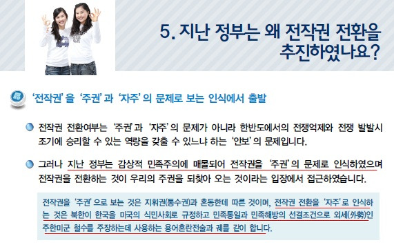 당연히 이 얘기에서도 일본을 한국으로 바꾼다 해도 전혀 어색하지 않다. 한국은 625가 발발하며 부산까지 몰리게 되자 이승만 대통령이 알아서 맥아더 장군에게 전시작전통제권戰時作戰統制權(이하 전작권)을 넘겼다. 그 후 긴 세월동안 주권국가임에도 전작권이 없는 상태로 지내왔다. 그러다 2012년 4월 17일로 돌려받기로 되어 있었지만, 역대 국방장관이나 예비역 장성들은 “전시작전권을 돌려받아서는 안 된다”고 외치기 시작했고, 그런 상황에 화가 난 노무현 대통령은 “(국방비 지출이 북한과 비교할 수 없을 정도인데도 전시작전권을 받지 말라는 건) 자기들이 직무유기 아닙니까?”라고 울분을 터치기도 했다. 하지만 이런 논의는 이명박 정부에 들어서 연기를 요청하여 2015년에 돌려받는 것으로 늦춰졌고, 박근혜 정부에 들어서는 다시 연기를 요청하여 2020년으로 밀렸다. 이뿐만 아니라 박근혜 정부에선 고고도 미사일 방어체계인 사드THAAD를 성주군 일대에 배치하겠다는 발표하기까지 했다.