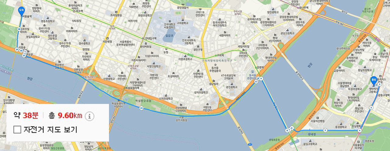 자전거를 타고 1시간에 갈 수 있는 거리면 대중교통을 이용하기보다 자전거를 타고 가는 편이다. 그래서 작년 남산공원 트래킹 땐 지훈이와 함께 자전거를 타고 갔으며, 올해 1학기엔 어린이대공원에 자전거를 타고 갔었다. 서울숲까지의 거리도 검색해 보니, 40분이면 갈 수 있는 거리더라. 그래서 자전거를 타고 가기로 했다. 더욱이 이 날은 무덥던 여름이 거짓말처럼 지나가고 선선해져서 라이딩하기 딱 좋은 날씨였다.