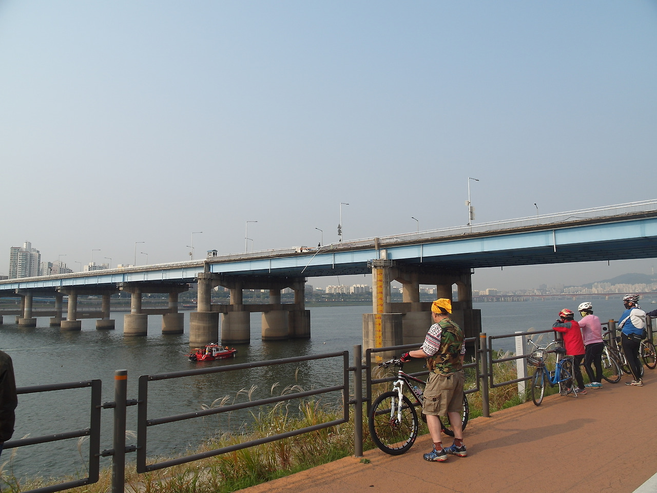 열심히 페달을 밟으며 달리고 있는데 영동대교를 지날 때쯤 ‘뭔가 이상하다’는 느낌이 들었다. 한강 자전거길 위에서 영동대교 쪽을 보며 몇 사람이 서있었고, 영동대교 난간이 부서져 있었으며, 부서진 난간 밑으론 119 배가 떠있었기 때문이다. 그건 차가 난간에 부딪혀 한강으로 떨어졌다는 상황을 짐작케 했다.