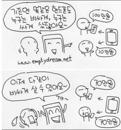 솔직히 단통법은 새 기계를 사는 사람에겐 그렇게 매력적인 정책이라고 할 수는 없다. 예전엔 최신식 기계도 때에 따라, 상점에 따라, 정보에 따라 더 싼값에 살 수 있었기 때문이다. 그에 비하면 지금은 어느 곳이나 가격이 같고 그때에 비하면 좀 더 비싼 가격에 구입해야 하니, 단통법을 싫어할 수밖에 없다.