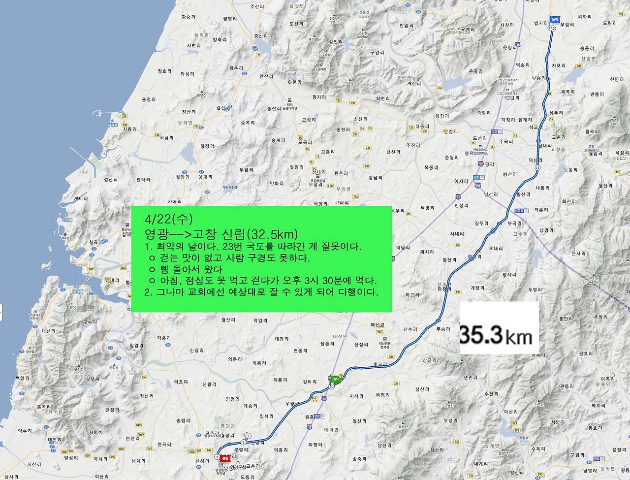 오늘은 23번 국도를 따라가기만 하면 된다. 더 빨리 갈 수 있는 일반도로가 있는 데도 헤맬까봐 쉬운 길을 택한 거다. 하지만 그 선택이 비수가 되어 돌아올 줄이야.
