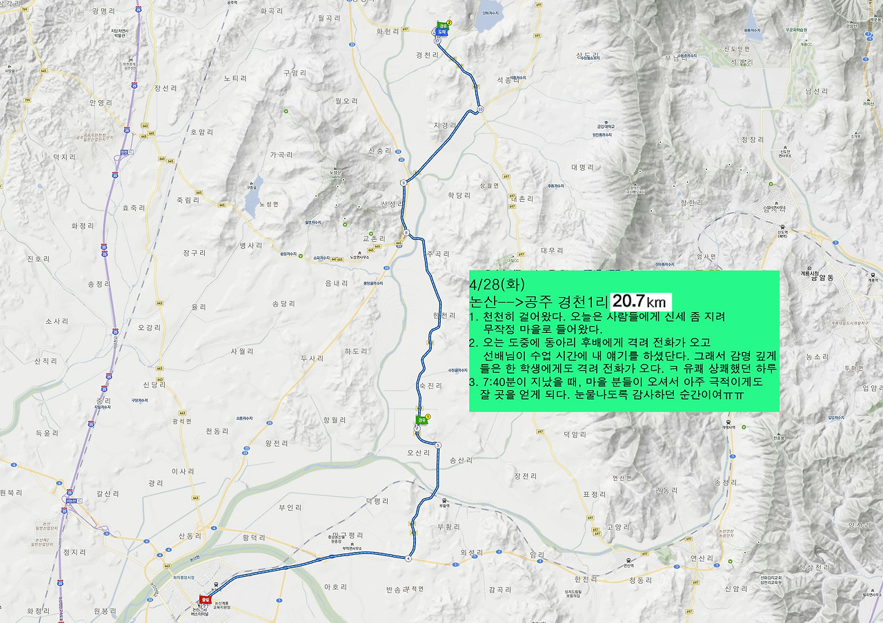 그런데 막상 받아 보니 그게 아니었다. 대뜸 “선배님!”이라고 외치는 것이다. 요즘 나에게 선배님이라 부르며 전화할 사람은 없었기에 적잖이 당황했다. 그러면서 자신에 대한 소개도 없이 다짜고짜 힘내라고 격려해주는 게 아닌가? 너무나 황당해서 자초지종을 들어보니, 윤교수님이 강의시간에 내가 도보여행을 하고 있다는 이야기를 했고 그 이야기에 감명 받아 나에게 넉살 좋게 전화를 했다는 거였다. 그런 자초지종이 있음에도 다 빼놓고 대뜸 선배님이라 부른 후 “힘내세요”라고 외쳤으니 당황스러울 수밖에 없었다. 그래서 나도 감사하다고 말을 건네며 마음을 전달했다.