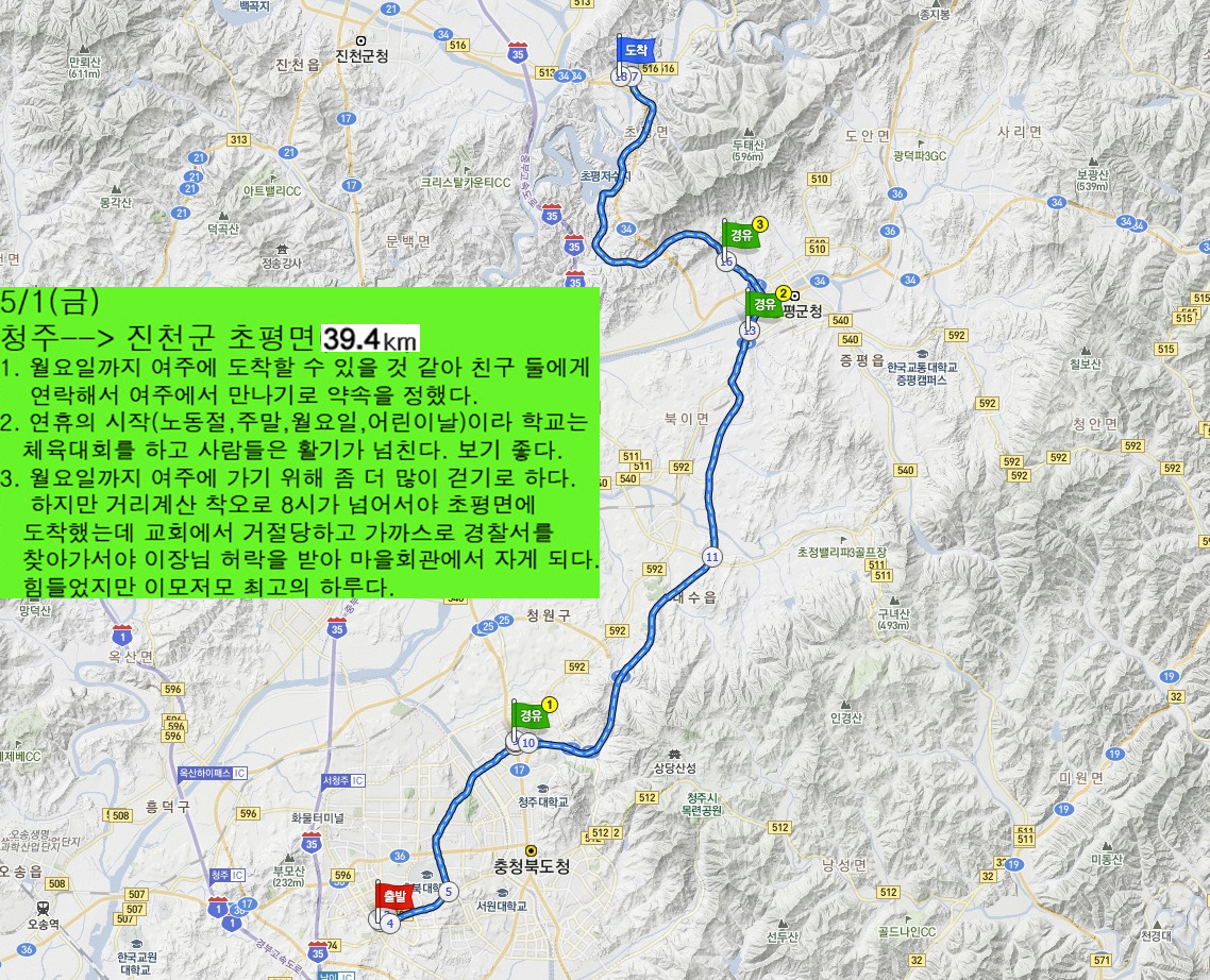 그렇게 정리하긴 했지만, 그건 어디까지나 친구들과 함께 계획을 짠 게 아니라 나만의 생각에 불과했다. 그래서 친구들에게 전화를 걸어 다음 주 월요일에 시간이 괜찮은지 물어봐야만 했다. 그랬더니 다행히도 두 명 모두 괜찮다고 하더라. 그렇다면 이제 남은 문제는 월요일 저녁까지 여주에 도착할 수 있느냐다. 대충 거리를 재보긴 했지만 그게 4일 만에 걸을 수 있는 거리(확인해 보니 거리는 112Km로 4일 만에 걷기에는 빠듯한 거리였다. 그러려면 4일 동안 죽을동 살동하며 무작정 걷기만 해야 한다)인지는 확실하지 않았다. 더욱이 내 체력이 그렇게 할 수 있도록 뒷받침을 해줄지도 미지수였다.
