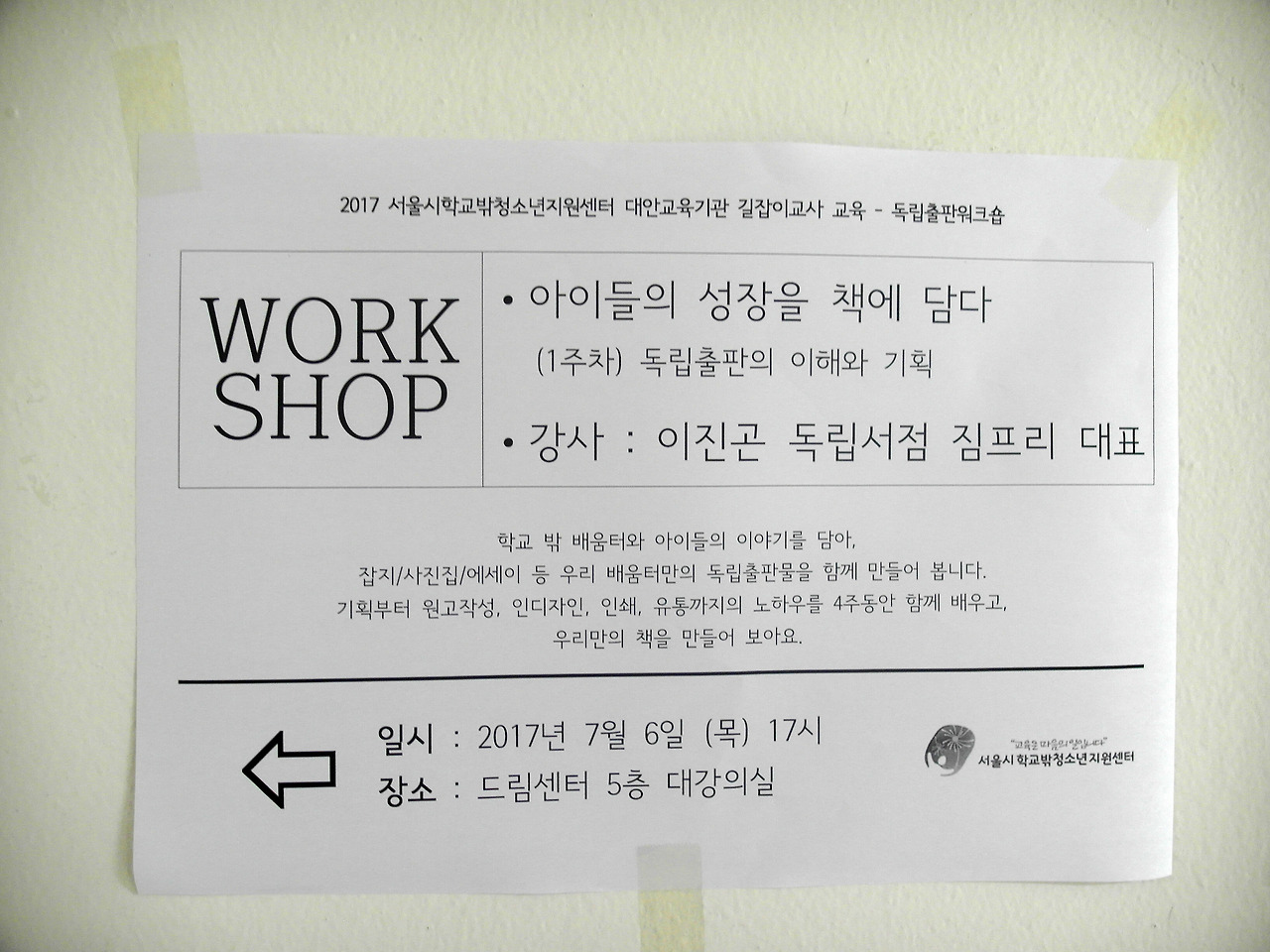 이번엔 서울시학교밖청소년지원센터에서 교사연수 프로그램을 마련했다. 이름하야 ‘독립출판 워크숍’이 그것이다. 우연처럼 6년이 흐른 지금 ‘출판’이란 키워드는 다시 나를 찾아왔다. 참새가 방앗간을 그냥 지나지 않는다고 늘 하고 싶었던 프로그램을, 그것도 무료로 배울 수 있는 기회를 어찌 두고 볼 수 있단 말인가. 물론 내가 신청하기 전에 지원센터에서 마련한 프로그램들엔 적극적으로 참여하자는 교사들 간의 합의가 있었기 때문에 겸사겸사 신청하게 되었다.