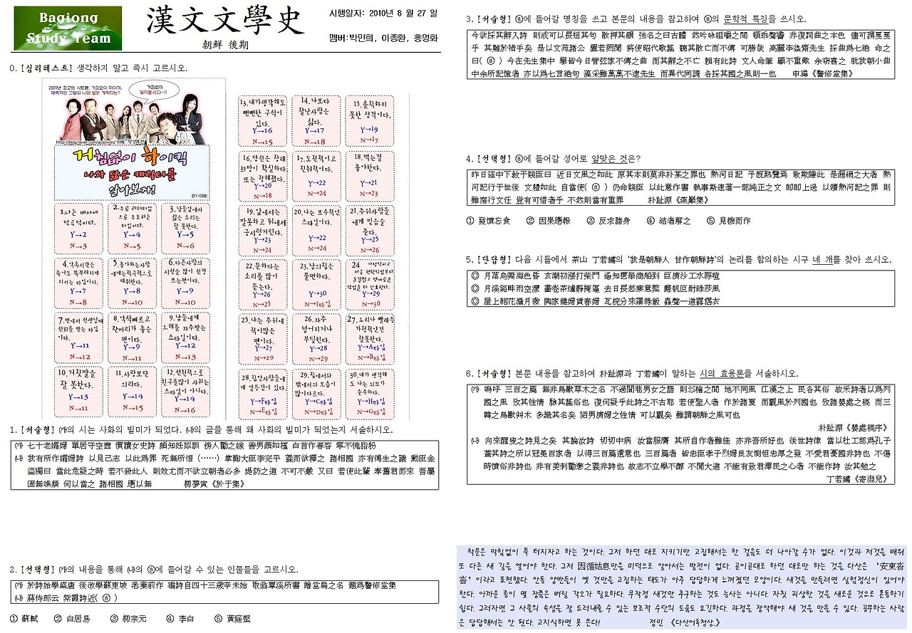 올해를 회고해 보면 정말 열심히 했다고 말할 순 없겠지만, 이러저러한 도전을 많이 해봤다고 말할 순 있다. 그건 결코 내 스스로 합리화하기 위한 말이 아니다. 내가 여태껏 꿈꾸어 오던 스터디를 처음으로 만들어볼 수 있었고 그러면서 공부하는 즐거움을 조금이나마 느낄 수 있었다. 더욱이 재작년부터 시작한 스터디와 근본적으로 다른 부분은 멤버들이 모두 교체되어 이제 막 임용공부를 시작하는 영화와 민희, 가을이, 진숙이와 함께 하게 됐다는 점이고 스터디 내용 중에 ‘낭송시간’, ‘독서토론회’와 같은 새로운 형식을 도입했다는 점이다.