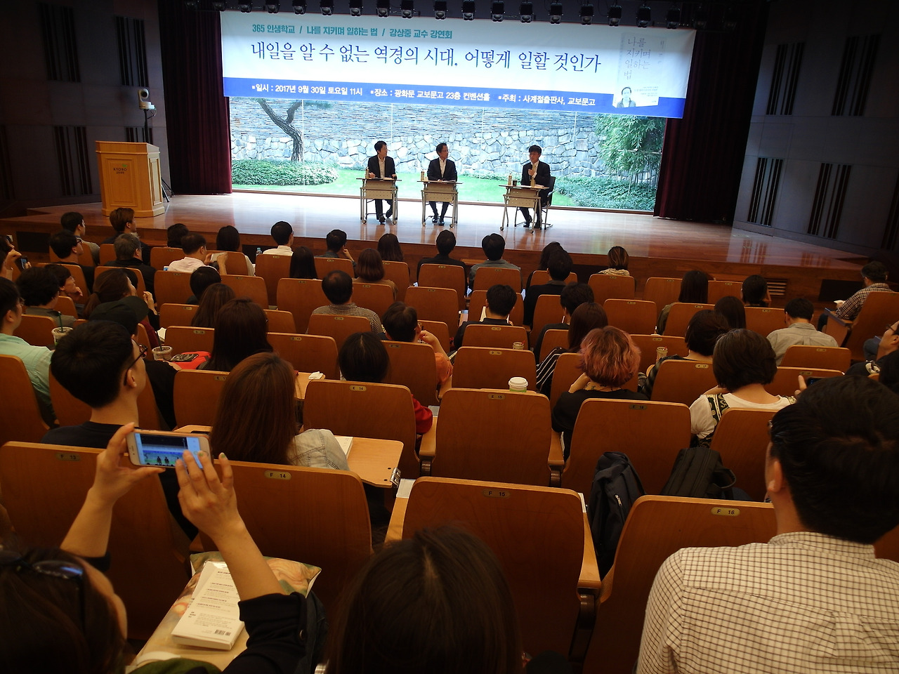 더욱이 강의의 제목이 ‘나를 지키며 일하는 법’이라지 않은가(물론 이번에 나온 책의 제목일 뿐이지만). 지난번에 썼던 ‘민들레 후기’에서 “일이 성취감을 주고 자존감을 높여주기도 하지만, 그게 너무 과하면 ‘내가 일만 하기 위해 태어난 것인가?’ 헛갈리기도 한다.”라고 썼듯이, 일은 더 이상 ‘자아실현’이 아닌 ‘자기 파괴’에까지 이르게 된지도 오래됐다. 이런 현실에서 과연 강상중쌤은 어떤 말씀을 하실까?