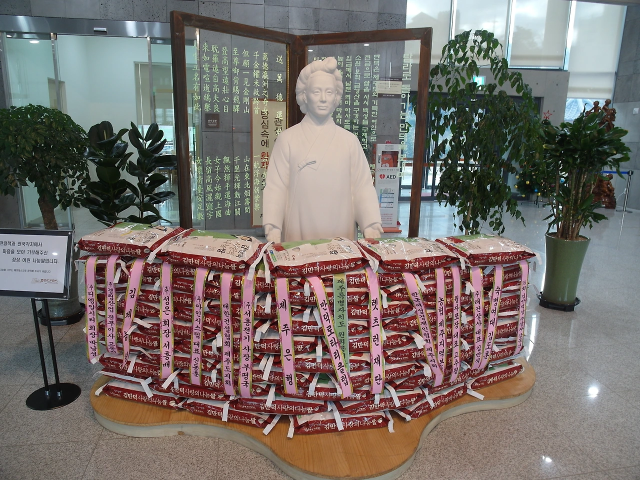 기념관에 들어서니 김만덕(1739~1812) 상과 그 앞에 나란히 쌓아올려 진열된 ‘김만덕 사랑의 나눔쌀’이란 포대자루, 그리고 그 뒤편으론 이가환李家煥(1742~1801)이 지은 「탐라로 돌아가는 만덕을 보내며(送萬德還耽羅)」라는 시가 쓰인 유리병풍이 둘러 있더라. 입구에 마련된 이 전시물만 보아도 김만덕에 대한 중요 정보를 얻을 수가 있고 이 기념관의 방향성을 알 수가 있다.