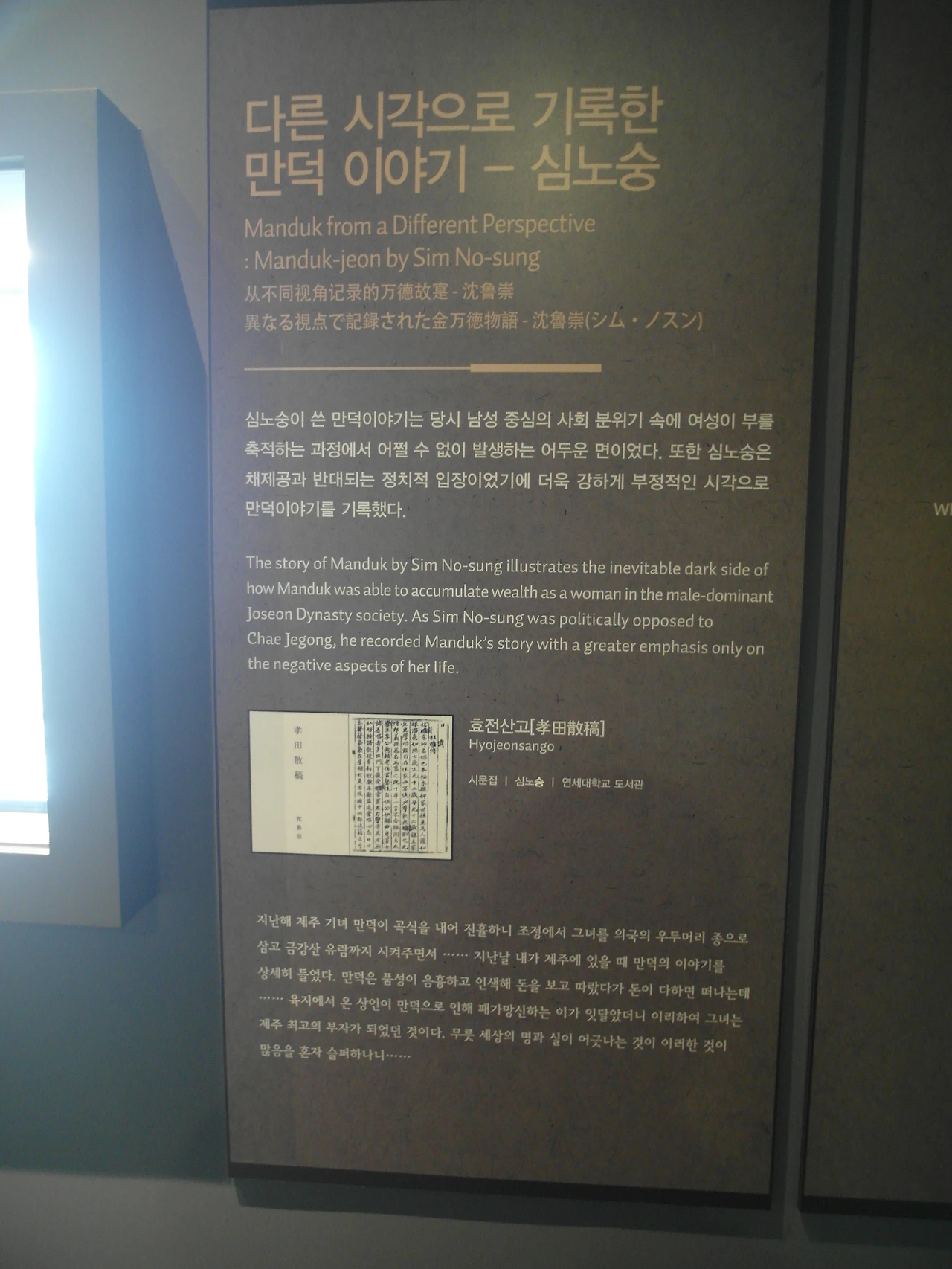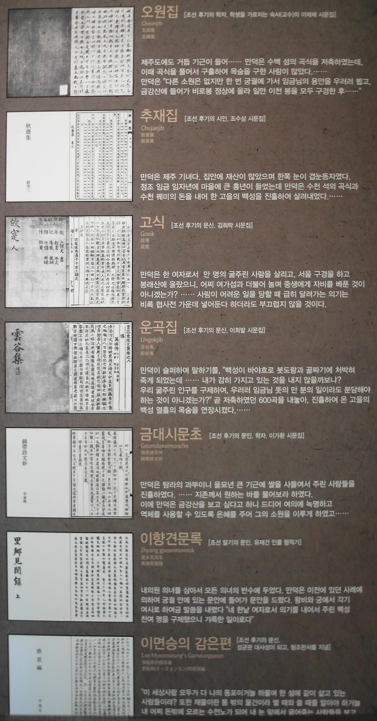 정조도 감각적으로 만덕의 이야기를 듣는 순간 ‘이건 글로 남겨야만 해’라는 필이 왔을 거다. 충분히 모범이 될 만한 스토리였으니 말이다. 그래서 만덕의 이야기를 글로 지으라고 명을 내렸고 수많은 문인들이 만덕의 이야기를 지어 그녀의 대담함, 그리고 돈을 제대로 쓸 줄 아는 지혜를 기렸다.