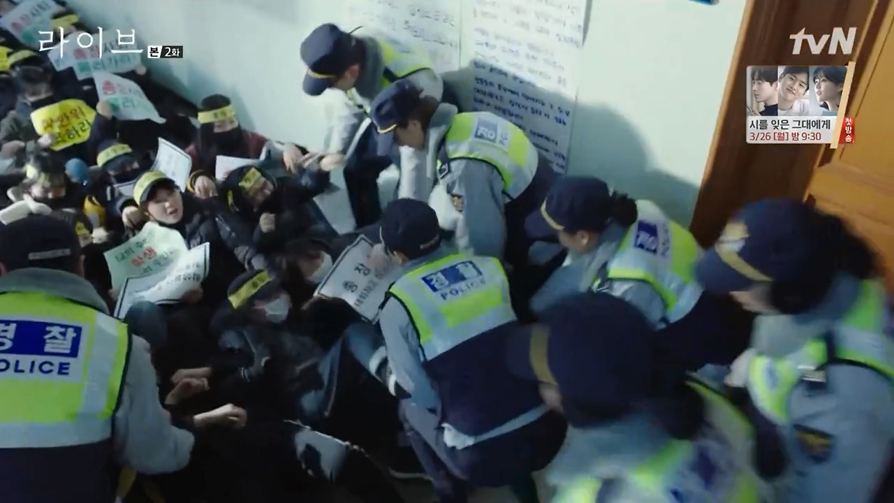 이 드라마의 2부에 나온 장면이 나의 두 눈을 번쩍 뜨이게 했고 가슴을 먹먹하게 했다. 중앙경찰학교에서 실습을 받던 그들의 마지막 테스트는 분쟁의 현장에 투입되어 그동안 갈고 닦은 실력으로 진압하는 것이다. 그런데 하필 그들은 대학 총장의 비리에 분개한 학생들이 총장실을 점거하여 총장사퇴를 외치는 현장에 투입되었다. 지금은 진압을 해야 하는 경찰 신분이지만, 실상 그들도 얼마 전까지만 해도 저 학생들과 별반 다를 게 없이 앞날이 불투명한 채 하루하루 버티어가던 소시민이었을 뿐이다. 그러니 진압해야 함에도 발이 수이 떨어지지 않는다. 다들 갈등하는 빛이 역력했지만 애써 바늘구멍 같은 시험을 통과하여 여기까지 왔고 이제 경찰이 되기 위한 마지막 관문만을 남겨두고 있는 상황이니 눈 질끈 감고 임무를 수행한다.