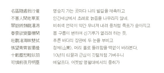 이런 사찰시의 기본적인 특성을 알고 이 시를 보면 깜짝 놀라게 된다. 어디에도 사찰이나 주지스님에 대한 묘사가 없을 뿐 아니라, 3구의 직소폭포에 대한 묘사는 정말 폭포를 본 사람만이 쓸 수 있을 정도로 잘 묘사해놨기 때문이다. 사찰시이지만 사찰의 모습은 온 데 간 데 없고 우리가 등산하며 봤던 모습들을 아주 핍진하게 묘사하고 있다. 5구에선 서서히 오르며 봤던 서해의 장엄한 모습이, 6구의 청제靑齊란 산동의 다른 표현으로 중국의 주인이 明에서 淸으로 바뀐 것에 대해 지식인으로서 느꼈던 무상함, 절망감이 짙게 배어 있다. 그리고 8구에선 아예 어젯밤 변산을 돌아보며 느꼈던 감상을 ‘애달프다’라는 감상으로 표현하고 있으니, 이 시를 읽는 것만으로도 내소사 부근의 풍경이 제대로 머릿속에 그려진다.