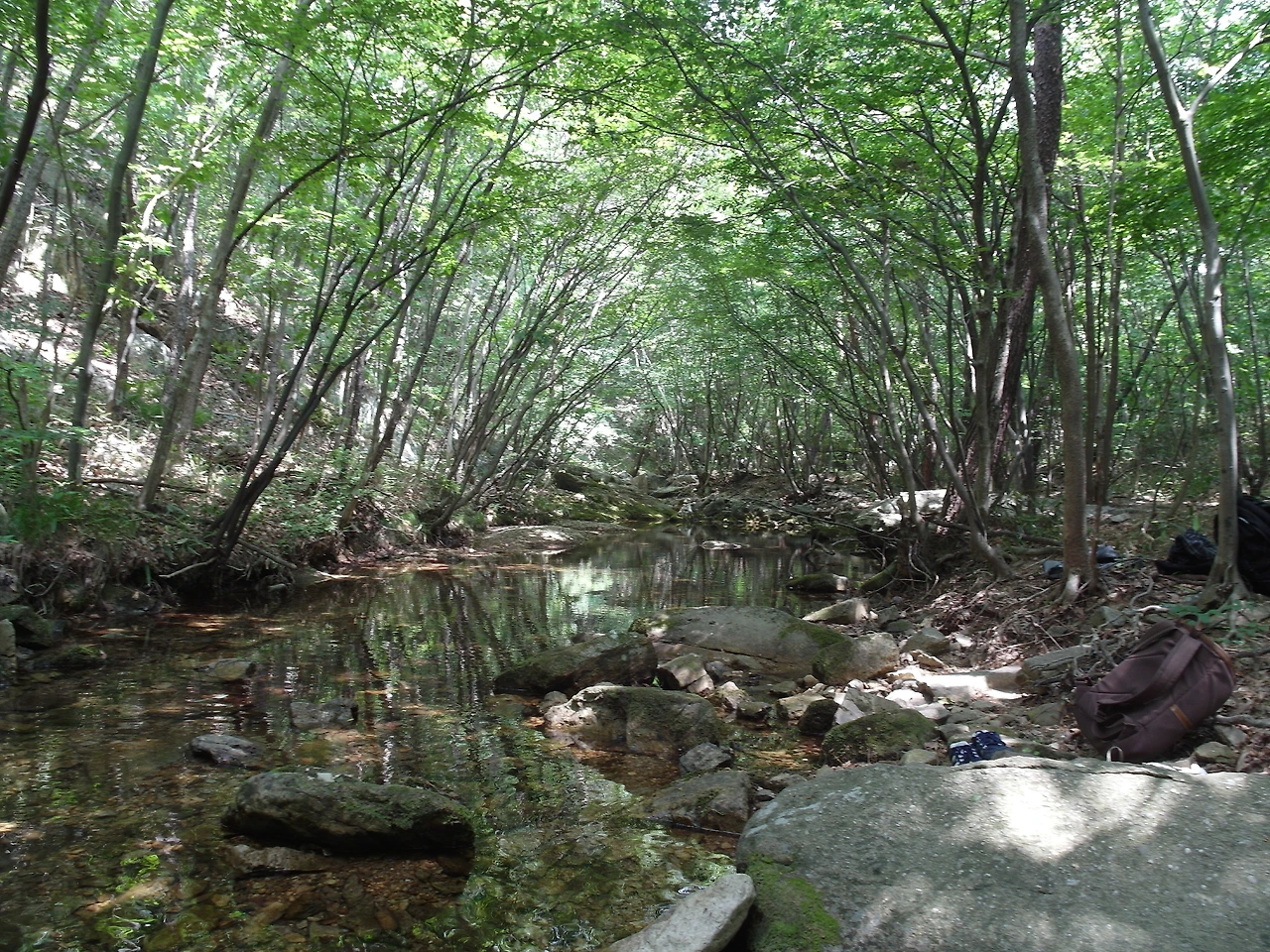 어느 정도 내려오니 계곡이 보였다. 물이 그렇게 많진 않아도 발을 충분히 담그고 있을 만했고, 물이 어찌나 차가운지 발을 계속 담그고 있으면 한기가 느껴질 정도였다. 함께 앉을 정도의 평평하고 큰 바위는 없어서 어떻게든 각자 앉았고 주전부리들을 세팅하기 시작했으며, 팩으로 사온 소주를 분배하기 시작했다.