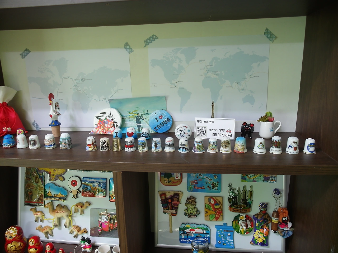 안쪽엔 앵두 전용 작업장이 있다. 자신만의 공부방이라고도 할 수 있고 이곳에서 수많은 상상이 현실이 되는 공간이라고도 할 수 있다. 그곳 장식장에서 한 번쯤 보고 싶었던 세계 곳곳에서 온 골무들이 있다. 그렇지 않아도 예전에 페이스북에 이 골무들을 모아 올린 사진이 있었기 때문에 ‘실물로 직접 보면 어떨까?’ 상상해보기도 했다. 그만큼 각 나라에서 온 골무들이 이렇게 한 곳에 모아놓으니 꽤나 이색적으로 느껴졌었고, ‘왜 각 나라별로 이런 특색 있는 골무를 만들게 됐을까?’ 궁금해지기도 했었다. 그렇게 궁금하던 골무들을 다름 아닌 이곳에서 이렇게 딱 마주쳐 볼 수 있게 되니 기분이 색다르더라.